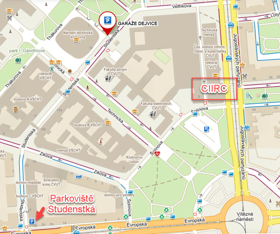 Parkovat můžete v přilehlých ulicích se zónami, nebo využijte parkovací domy Dejvická a Studenstká v ulici Studentská.