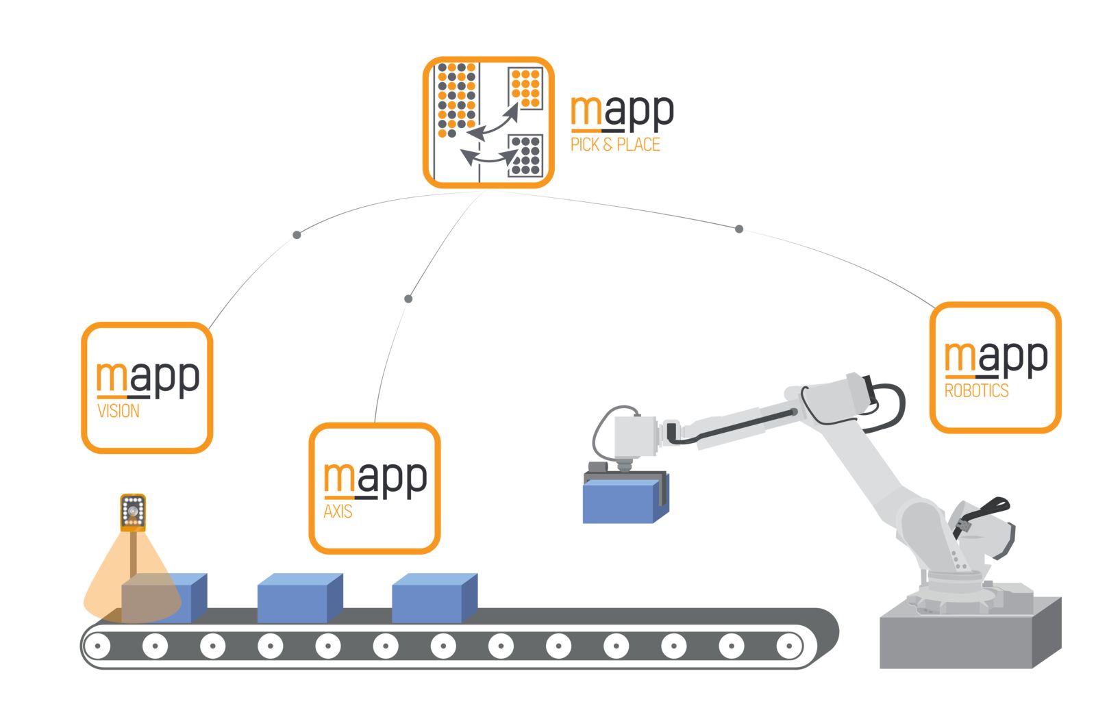 Softwarové řešení mapp Pick-and-Place nabízí maximální svobodu při navrhování procesů. Lze použít libovolný počet delta robotů. Volně konfigurovatelný je také počet dopravních pásů pro přísun a výdej výrobků Zvláštní výhodou je, že software automaticky optimalizuje proces pro maximální rychlost manipulace.