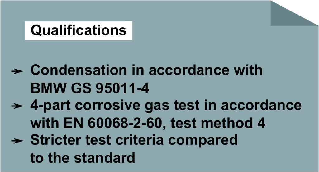 The coating on the electronics module protects the components and circuit board from the effects of condensation and corrosive gases. The effectiveness of protection against condensation is checked using the test specified in BMW GS 95011-4, and protection against corrosive gases using the 4-part corrosive gas tests specified in EN 60068-2-60, test method 4. The tests are completed both in the company testing lab, which is accredited in accordance with EN ISO/IEC 17025:2007, and at certified external testing facilities. There, the products undergo further testing to check their durability – even beyond standard requirements.
