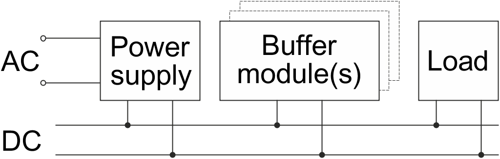 Vyrovnávací modul nepotřebuje žádné řídicí vedení. Lze jej na libovolném místě paralelně zapojit k obvodu zátěžového proudu. Pro redundanci a prodloužení vyrovnávacího času lze paralelně zapojit až pět vyrovnávacích modulů. Dvojité svorky umožňují snadné zapojení.