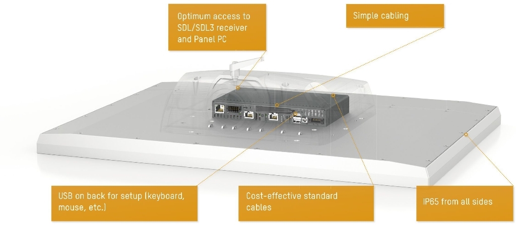 All Automation Panel 5000 devices can be upgraded to a full-fledged PC system by adding a Panel PC 2100, which is no larger than a Smart Display Link receiver. Connecting cables to the Ethernet and fieldbus interfaces is also extremely user-friendly since they are all easily accessible.