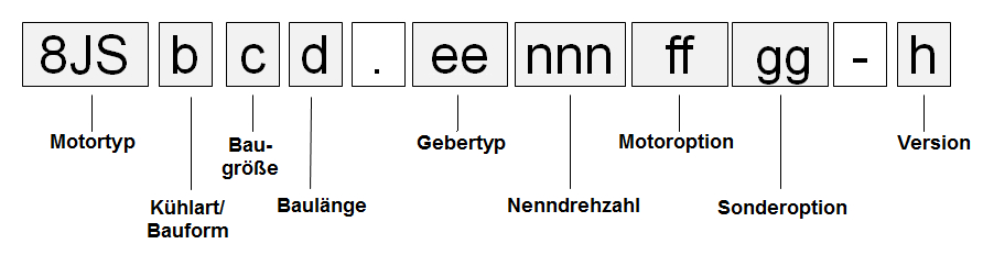 Die Drehstrom-Synchronmotoren 8JSB / 8JSQ sind in fünf verschiedenen Baulängen erhältlich. Diese unterscheiden sich in den Leistungsdaten bei identischen Flanschabmessungen. Die verschiedenen Baulängen werden durch eine Ziffer (d) in der Bestellbezeichnung unterschieden.