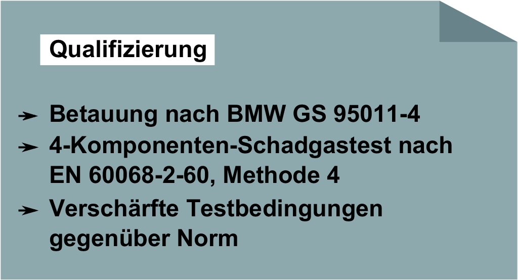 Die Beschichtung der Elektronik-Baugruppe schützt Bauteile und Leiterplatte vor den Auswirkungen von Kondensation und schädlichen Gasen. Geprüft wird die Wirksamkeit der Abhaltung von Kondensat durch Test nach BMW GS 95011-4, der Schutz vor Begasung mittels des 4-Komponenten Schadgastests nach EN 60068-2-60, Methode 4. Die Tests erfolgten sowohl im firmeneigenen Prüflabor, das nach EN ISO/IEC 17025:2007 akkreditiert ist, als auch in zertifizierten externen Prüfstellen. Dort wurden die Produkte zusätzlich weiteren Tests unterzogen, in denen sie auf Widerstandsfähigkeit sogar über normative Anforderungen hinaus geprüft werden.