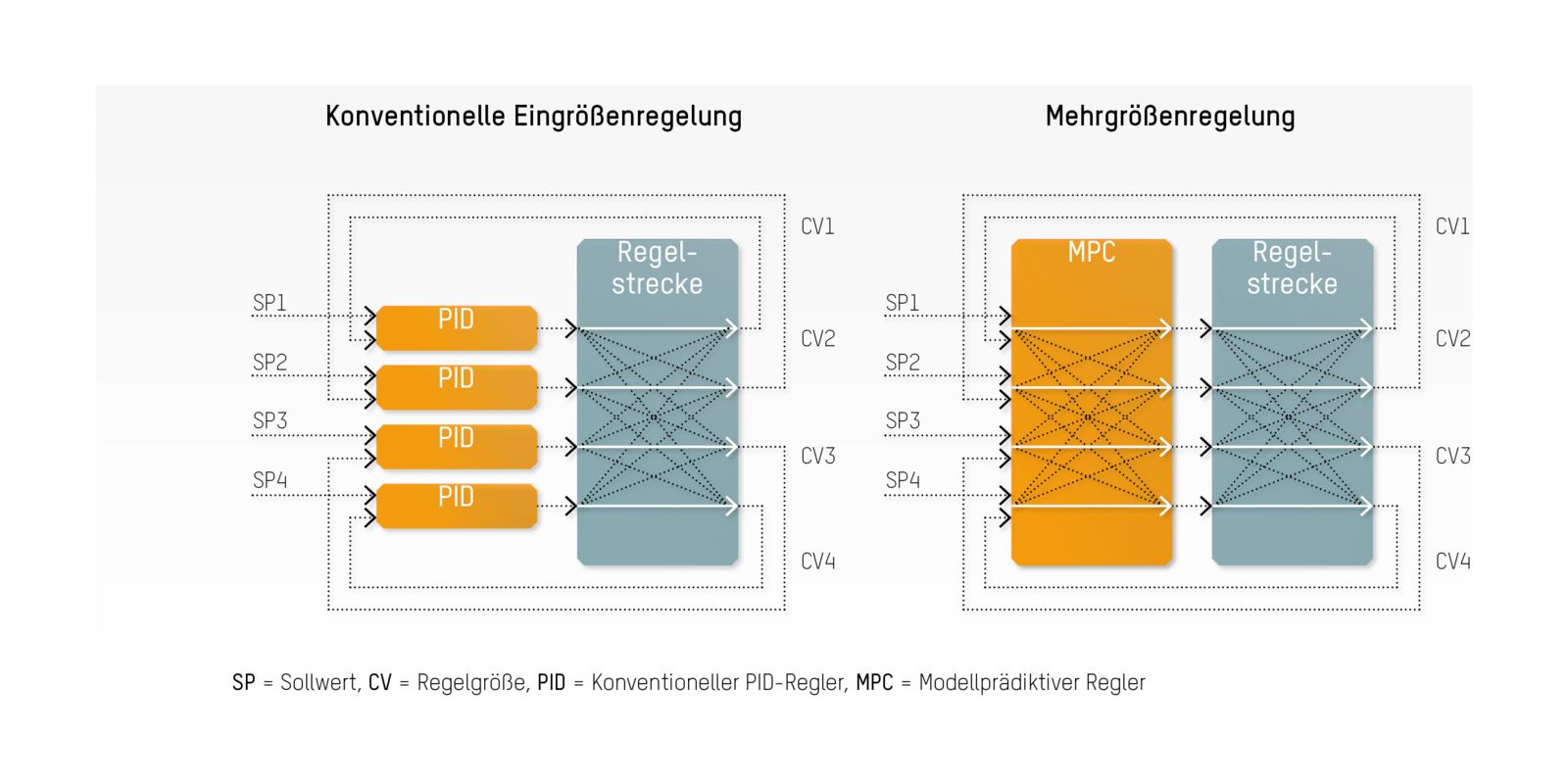 Im Gegensatz zu konventionellen Eingrößenregelungen berücksichtigt die Mehrgrößenregelung die gegenseitigen Abhängigkeiten verschiedener Regelgrößen.