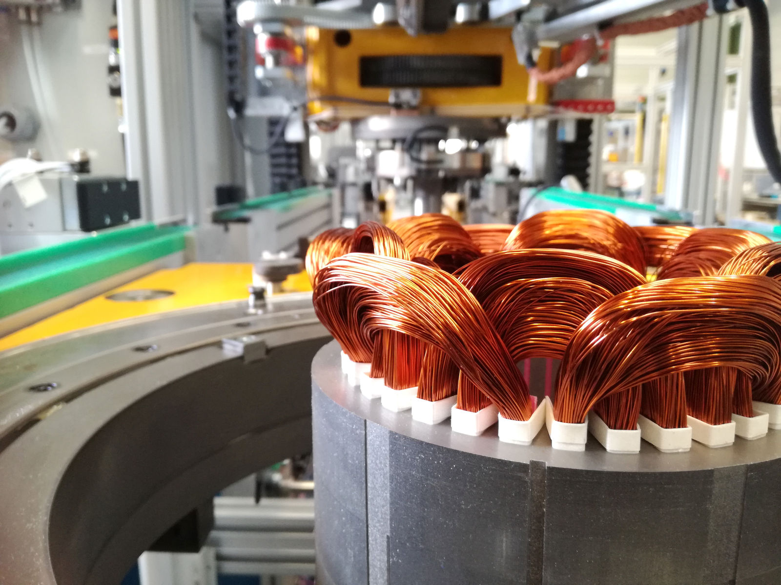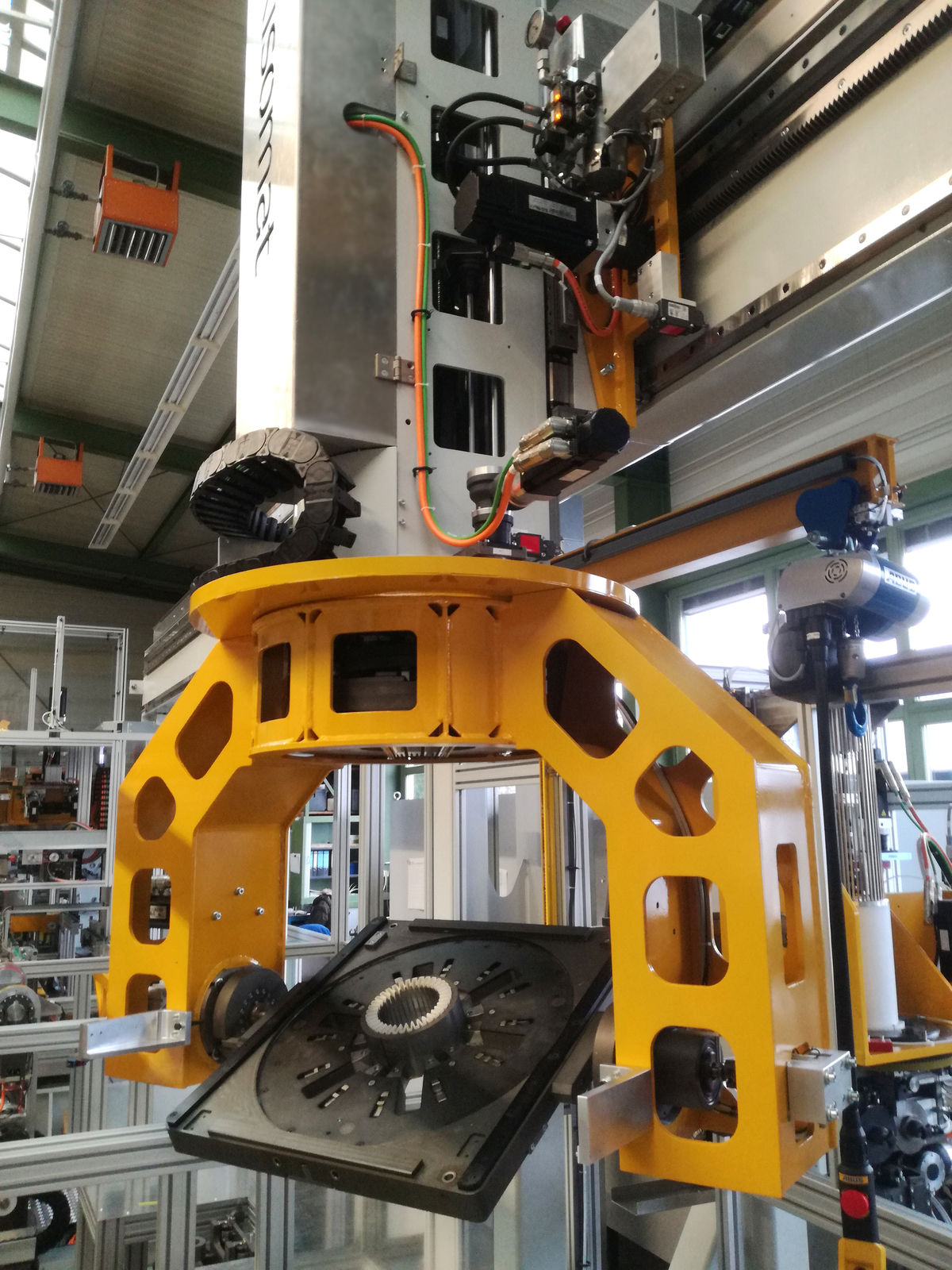 „Unser neues Fertigungskonzept für die Herstellung von Statoren für Elektromotoren basiert auf einem patentierten Portalkran, der mehrfach von Arbeitsstationen benötigte Funktionen wie drehen, schwenken, spannen oder positionieren bereitstellt und – selber mit Werkzeugen ausgestattet – auch Prozessaufgaben übernimmt. „Das vereinfacht den Aufbau der Arbeitsstationen und macht die Anlagen wesentlich flexibler“, beschreibt Hubert Halder, Geschäftsführer der risomat GmbH in Baienfurt, ein wesentliches Erfolgsmerkmal des neuen Anlagentyps. Das Unternehmen baut Spezialmaschinen für die Herstellung von Elektromotoren, Generatoren, Pumpen, Automobilkomponenten und Linearmotoren und ist in Europa einer der Technologieführer auf diesem Spezialgebiet. Der Anlagentyp mit Portalkran ist für eine effiziente Herstellung variabler Statorypen mit verschiedenen Außendurchmessern und Statorlängen ausgelegt und erlaubt die flexible Fertigung geringer Stückzahlen.