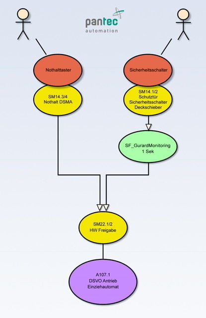 Bei der Problematik der verschiedenen Sicherheitszonen war Hartmann und seinem Team aber schnell klar, dass eine klassische textuelle Beschreibung der Sicherheitslogik nicht ausreicht, um die Systemzustände vollständig und transparent zu beschreiben. Mit der Idee UML, die Pantec in der Softwareentwicklung unter anderem für dynamische Zustandsbeschreibungen einsetzt, auch für die Herleitung und Beschreibung der Safety-Zustände zu verwenden, wurde der Weg zu einer Lösung geebnet. Auf der Grundidee UML wurde ein dreistufiger Safety-Prozess entwickelt, der den Weg vom freigegebenen Sicherheitskonzept zur getesteten Sicherheitssteuerung beschreibt. Dieser Prozess ermöglicht es, die Logik einer sicheren Applikation transparent zu entwerfen und zu dokumentieren. Damit lässt sich bei der Abnahme die Funktion der Safety-SPS nachvollziehbar und lückenlos prüfen und dokumentieren.