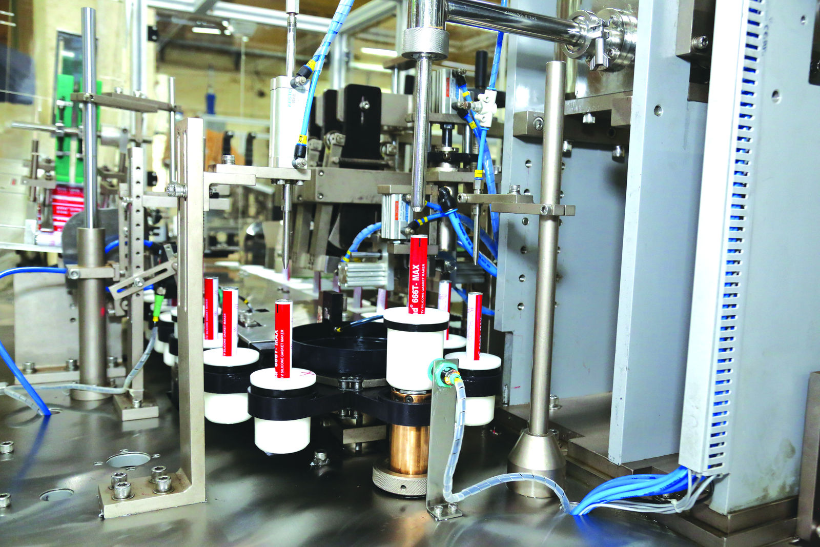 PK 60 AL machine is automated entirely by B&R – from controller to drives. It can accommodate tubes of four different sizes or weights, for example 15, 25, 85 and 100 grams. "Tube filling occurs at high speeds, and our machine is capable of achieving speeds of over 60 tubes per minute. We are able to achieve a filling accuracy of ±1%, which greatly limits waste," says Clifford. A "no tube - no fill" device adds intelligence to the machine, allowing it to sense whether or not a tube is present.