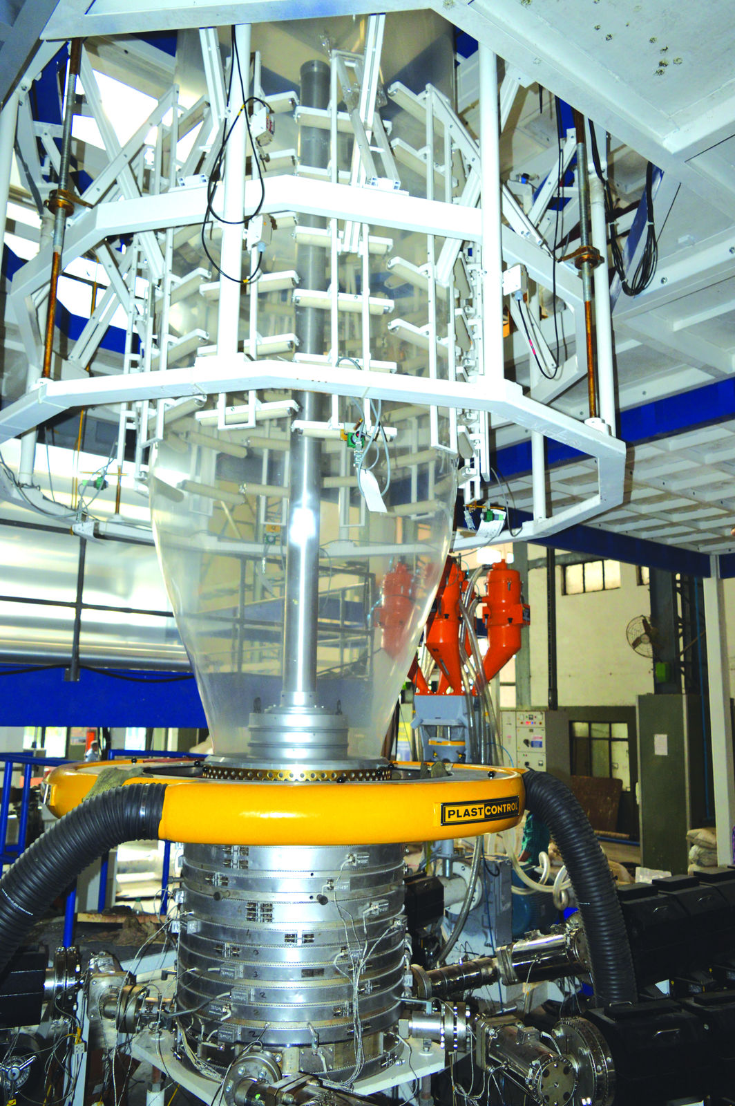 Extruders are used to heat the raw material before it is blown into a film. The choice of raw material depends on the desired film thickness and transparency. The number of extruders determines the number of layers – the five-layer blown film plant consists of five extruder units. These feed molten plastic to a unit from PLAST-CONTROL, which blows it into a film bubble. With the help of guides, this bubble is directed upwards and then split onto different rollers. The film is then rolled onto winders, which support auto-splicing to make the process continuous.