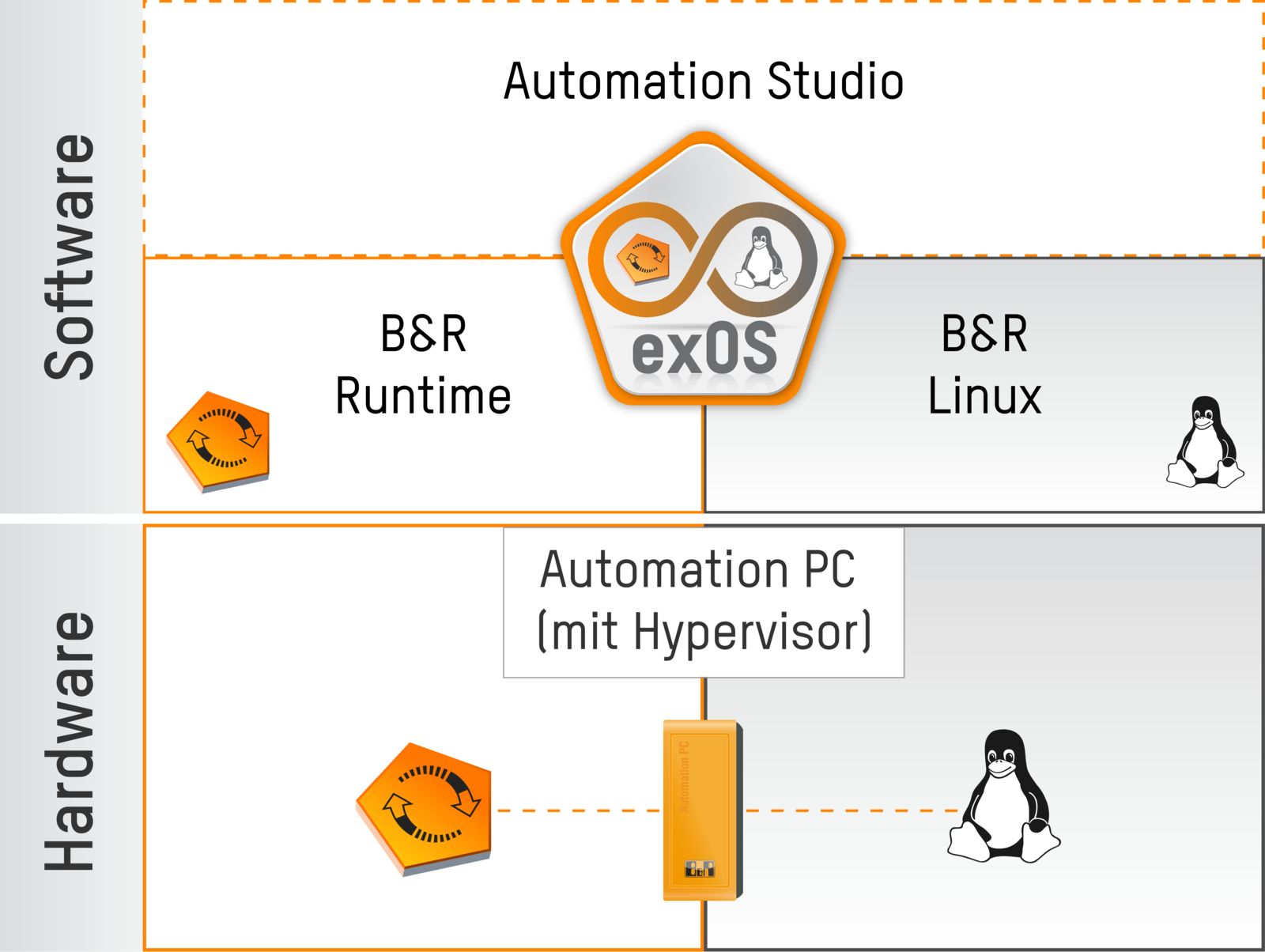 Um exOS zu nutzen, benötigen Maschinenbauer lediglich einen Automation PC oder Panel PC von B&R. „Automation Runtime und Linux laufen auf demselben Gerät. Das heißt, die Linux-Anwendung wird Hand in Hand mit zyklischen Steuerungs-Anwendungen ausgeführt. Das ist unter anderem bei fahrerlosen Transportsystemen (FTS) von Nutzen“, sagt Schönegger. Solche Transportsysteme basieren zum Beispiel auf der Open-Source-Robotikplattform ROS. Dabei läuft die dynamische Pfadplanung in ROS unter Linux, die Antriebsregelung hingegen in Automation Runtime. Beides lässt sich mit exOS in einer Hypervisor-Konfiguration optimal synchronisieren und einfach auf einem Automation PC integrieren.