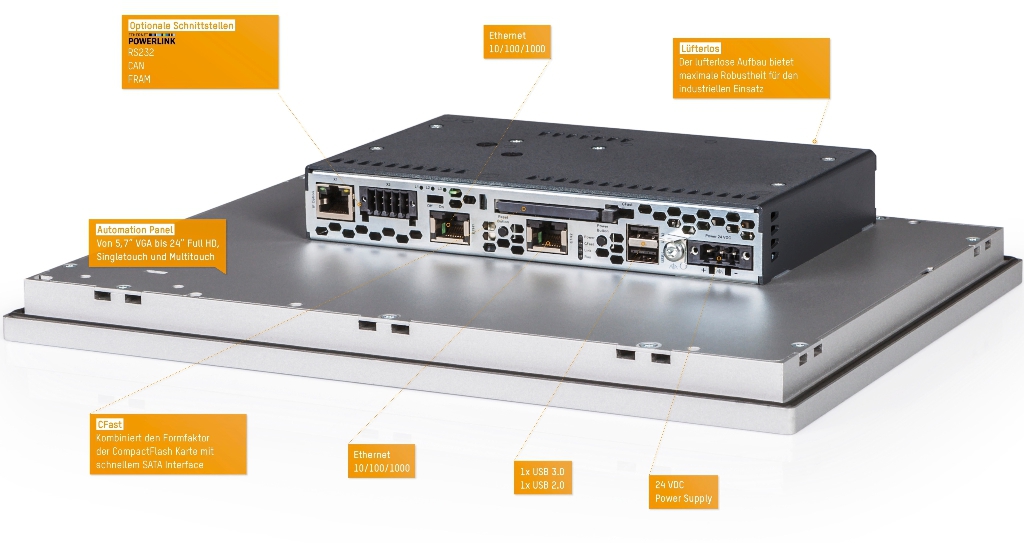 Die zentrale Komponente besteht aus dem Panel selbst, das durch den modularen Smart Display Link zum Automation Panel wird. Alternativ können natürlich auch mit Smart Display Link 3 alle Möglichkeiten für große Distanzen und einfache Verkabelung genutzt werden. Dasselbe Panel wird bei Anbau der PC-Einheit zum vollwertigen Panel PC mit skalierbarer Rechenleistung. Die Verwendung derselben frontseitigen Plattform reduziert die Lagerhaltung für Ersatzeile. Für kundenspezifische Varianten ist beim Einsatz von Automation Panels und Panel PCs nur eine Basisvariante zu erstellen.