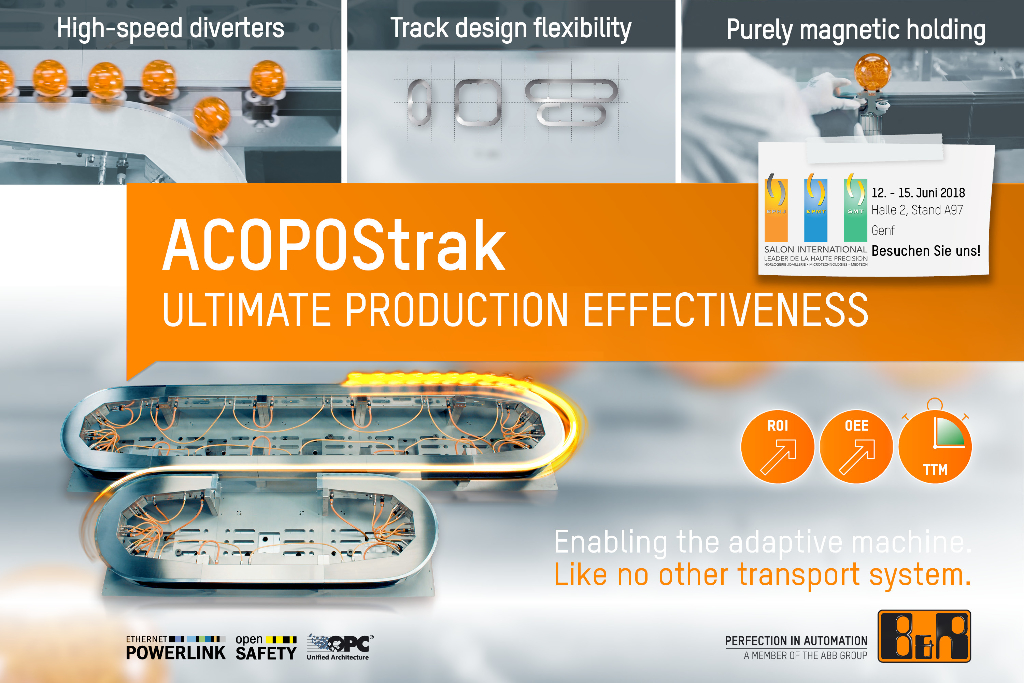 B&R präsentiert vom 12. - 15. Juni in Genf die nächste Evolutionsstufe der intelligenten, flexiblen Transportsysteme und wie man damit die Effizienz in der Produktion steigern kann. Erleben Sie live die faszinierende ACOPOSTrak Technologie am B&R…
