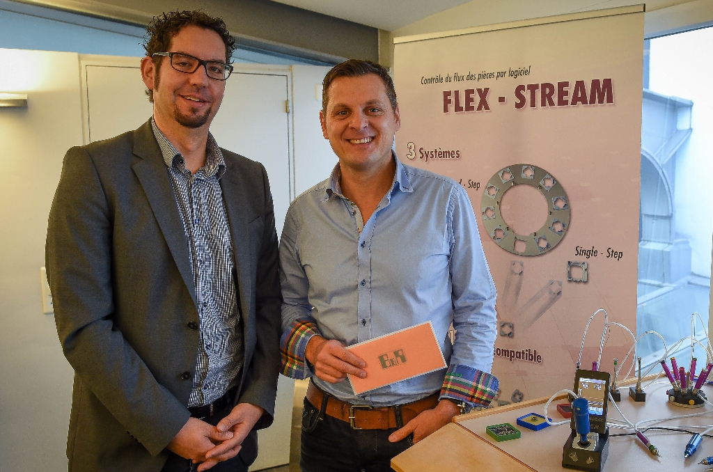 Frauenfeld, 20.11.2014 – Christoph Tobler, Büroleiter der Westschweizer Niederlassung von B&R Schweiz in Biel, überreicht Daniel Affolter, COO, Lécureux SA, in Biel, den Verlosungspreis der Wettbewerbsverlosung, die anlässlich der Technologiemesse…