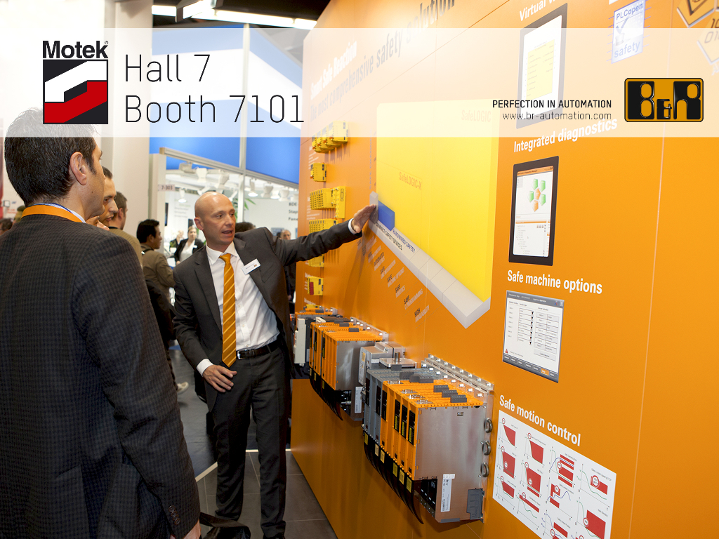 Vom 7. bis 10. Oktober findet in Stuttgart die Motek 2013 statt. In Halle 7, Stand 7101 präsentiert B&R die neuesten Automatisierungslösungen, fünf Trendthemen stehen besonders im Fokus: Energie-Monitoring, effizientes Engineering, eine virtuelle Safety-Lösung, erweiterte Sicherheit für Robotik-Anwendungen und Redundanz mit Standardkomponenten.