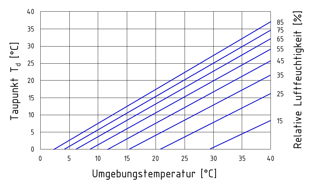 Taupunkt Diagramm: Der "Taupunkt" (links) ergibt sich aus dem Schnittpunkt von "Umgebungstemperatur" (unten) und "relative Luftfeuchtigkeit" (rechts). | ![]() | |||