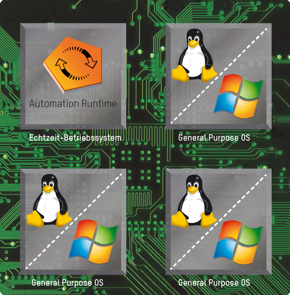 Mit Automation Runtime embedded kann der APC mobile zu einer hochperformanten, echtzeitfähigen Steuerung erweitert werden. Durch den Einsatz des B&R Hypervisors können mehrere Betriebssysteme parallel auf einem Rechner genützt werden.