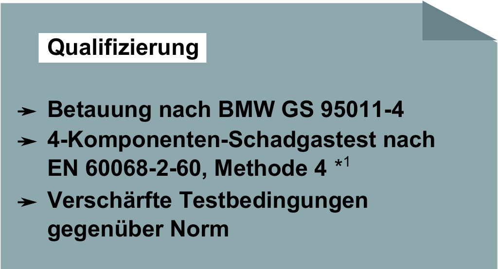 Die Beschichtung der Elektronik-Baugruppe schützt Bauteile und Leiterplatte vor den Auswirkungen von Kondensation. Geprüft wird die Wirksamkeit der Abhaltung von Kondensat durch Test nach BMW GS 95011-4, der Schutz vor Begasung mittels des 4-Komponenten Schadgastests nach EN 60068-2-60, Methode 4. Die Tests erfolgten sowohl im firmeneigenen Prüflabor, das nach EN ISO/IEC 17025:2007 akkreditiert ist, als auch in zertifizierten externen Prüfstellen. Dort wurden die Produkte zusätzlich weiteren Tests unterzogen, in denen sie auf Widerstandsfähigkeit sogar über normative Anforderungen hinaus geprüft werden.