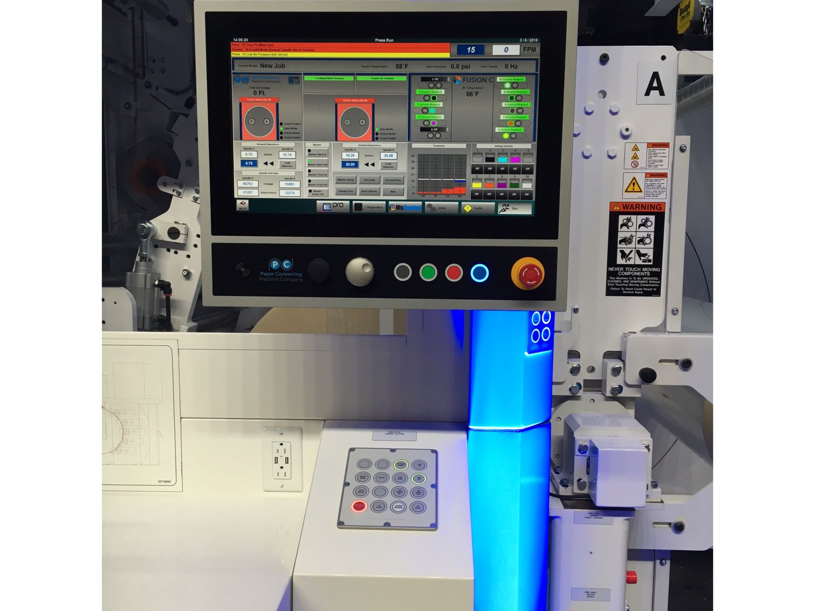 Branchentrends erforderten Bedienfunktionen, die so benutzerfreundlich und intuitiv sind, dass sich Bediener das Wissen das sie benötigen schnell aneignen können, um optimale Druckergebnisse zu erzielen. Um diesen Bedarf zu decken, arbeiteten PCMC und B&R gemeinsam an einer optimalen Lösung, die die Steuerungstopologie vereinfacht, in dem verdrahtete Komponenten - wie Drucktasten - durch vernetzte Leuchtringtasten ersetzt werden.