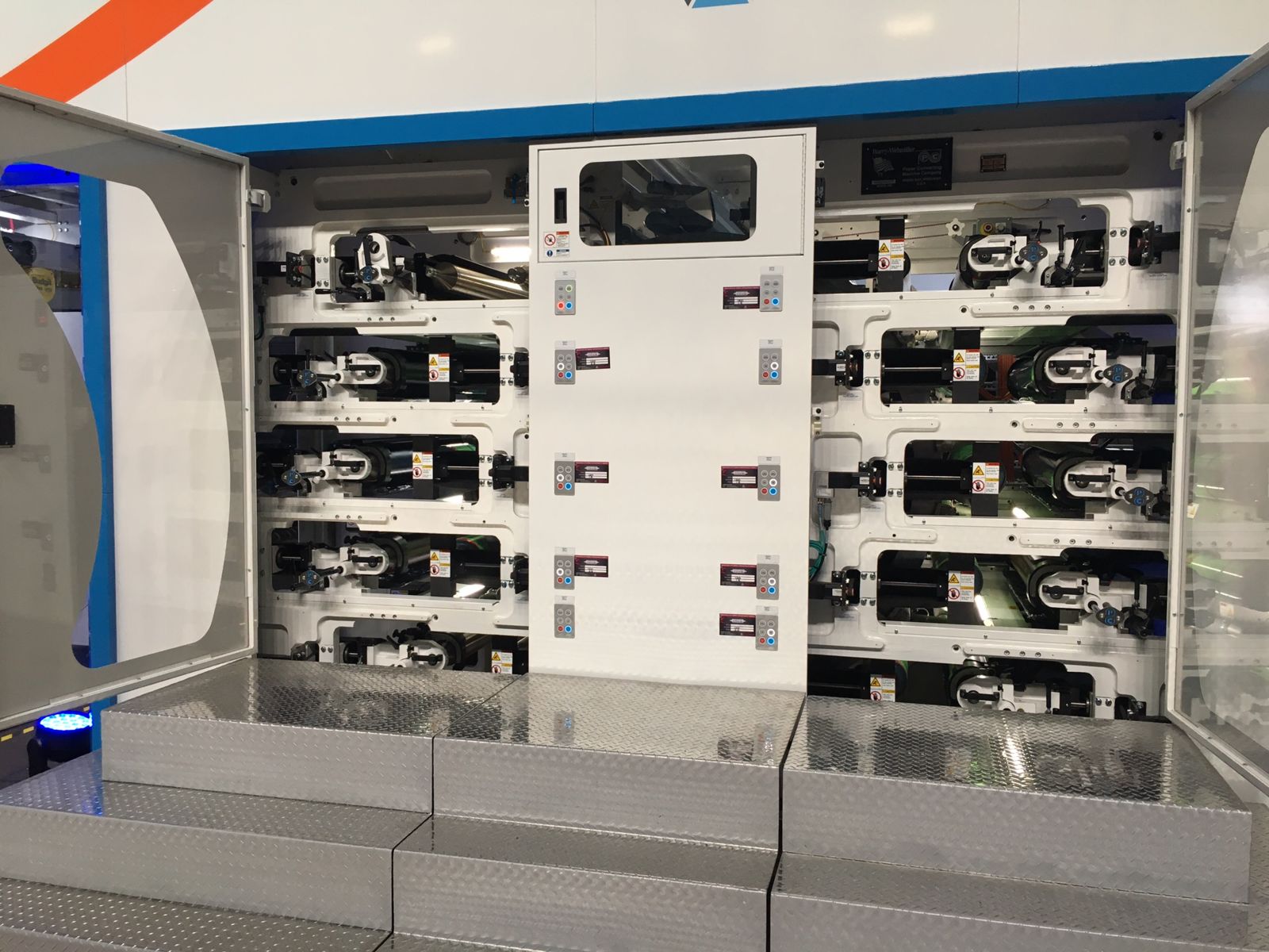 Die Touchscreen-Bedienstation, ein kundenspezifischer Panel PC von B&R, stellt die zahlreichen Funktionen der Druckmaschine im benutzerfreundlichen 16:9-Format zur Verfügung. Die an einem Schwenkarm montierte HMI-Einheit mit integriertem PC wurde stark an die Maschine und deren Anwendungen angepasst. Der Controller kommuniziert zum Beispiel mit einem vernetzten Drehgeber über die X2X-Extended-Backplane-Technologie von B&R. So kann schnell von der Bedienstation aus auf Offsetdruckänderungen reagiert werden. Die Applikation enthält außerdem ein RFID-Lesegerät für die Zutrittskontrolle und fernmontierte X2X-vernetzte B&R-Leuchtringtasten, die speziell für eine Klasse I Div 2-Umgebung mit lösemittelbasierten Tinten entwickelt wurden.