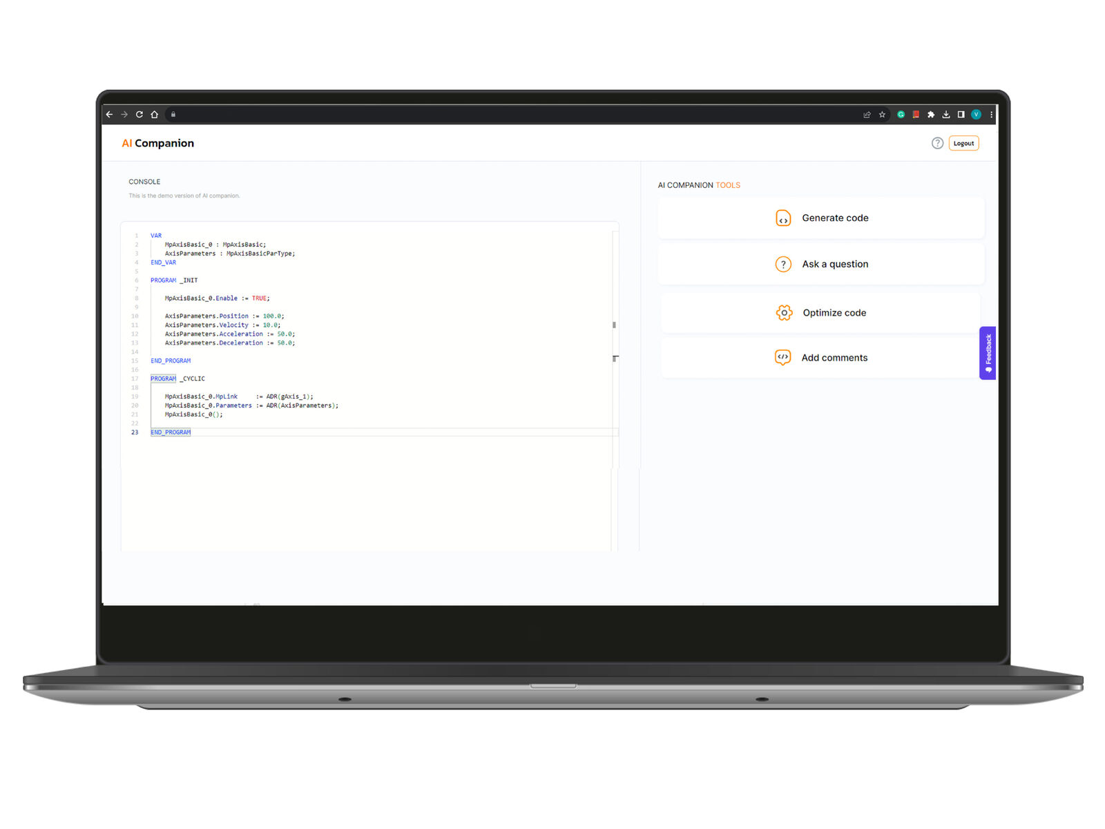 The tool's AI-driven code generation is optimized for IEC 61131-3 Structured Text programming and provides responses based on B&R's existing libraries and conventions. By replacing manual coding with natural-language prompting, it gives developers more time to focus on creative problem solving and rapid prototyping and deliver more competitive solutions fast.