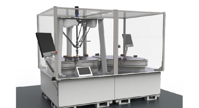 Experience the power of adaptability: Made possible by two loops of ACOPOStrak, two vision systems, a Codian delta robot and digital twin simulation.