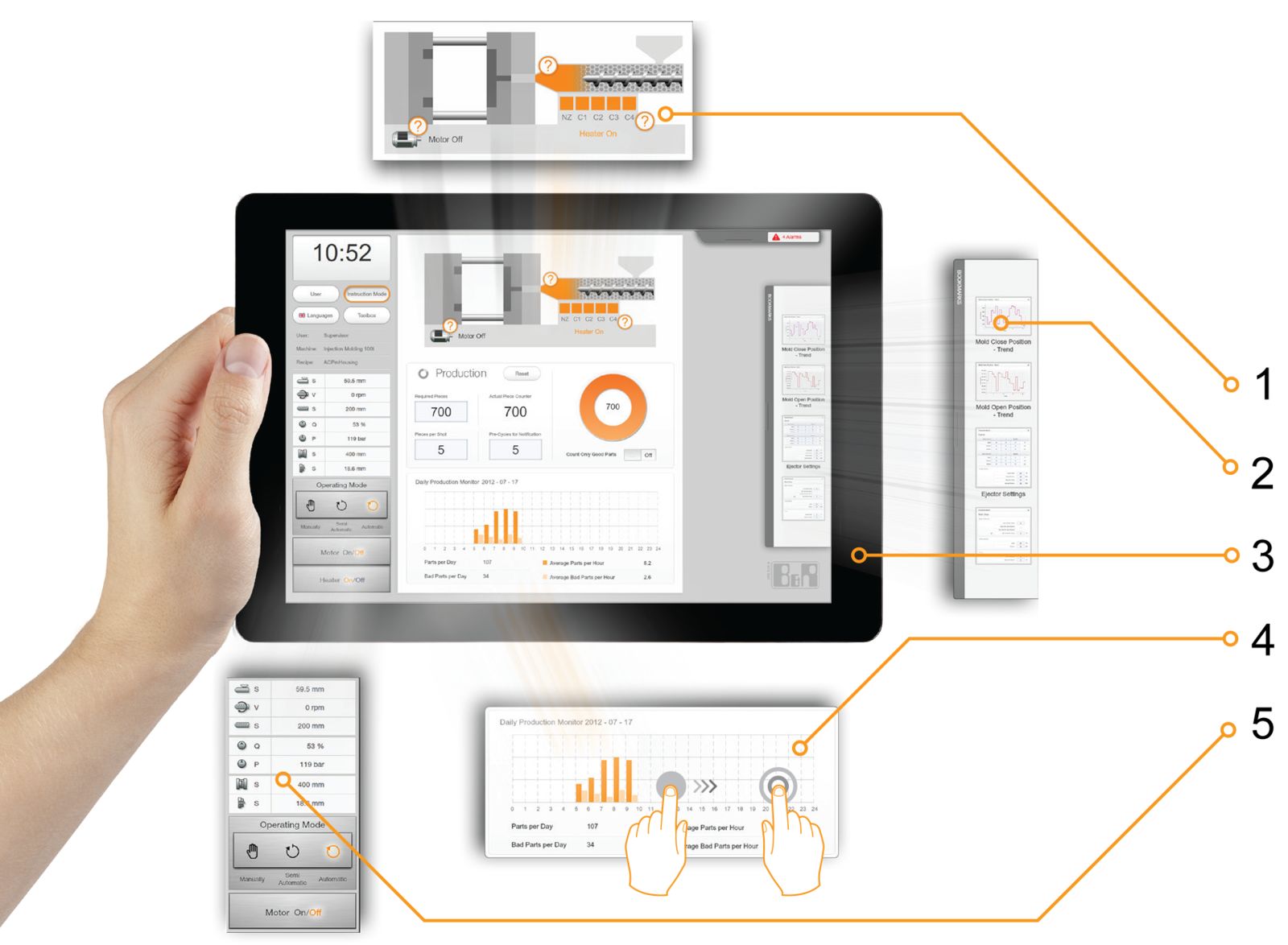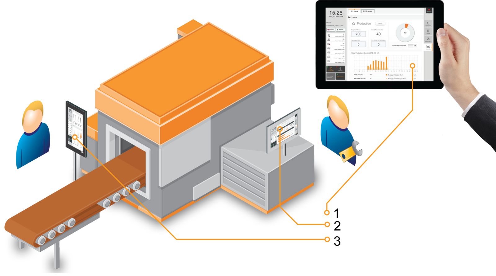 Cada uno de los usuarios necesita acceder a diferentes contenidos. mapp View permite implementar vistas basadas en roles sin tener que programarlas en la aplicación de la máquina. Estas pantallas personalizadas pueden incluso visualizarse en distintos dispositivos simultáneamente.
