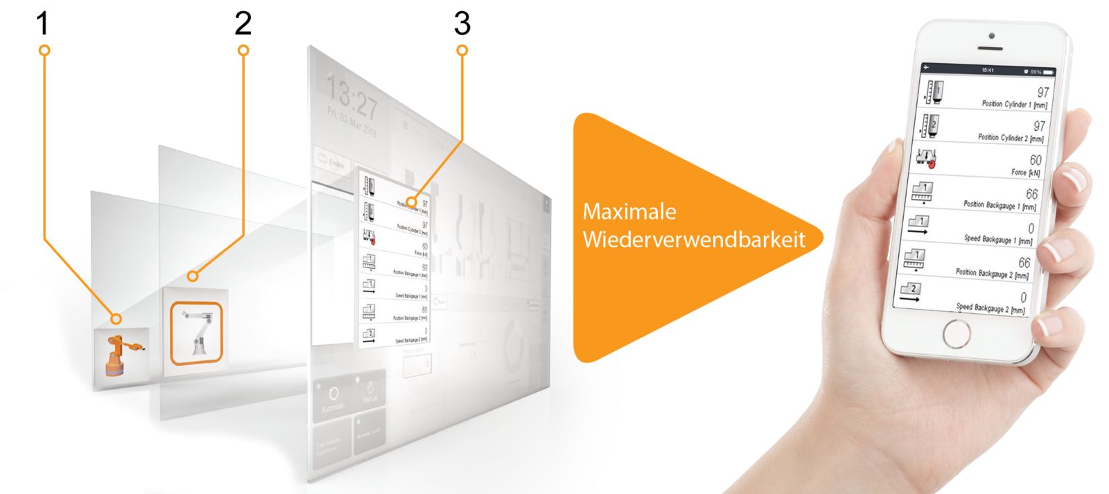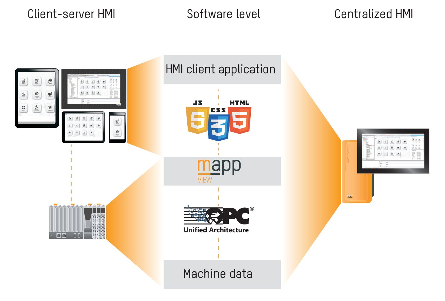 mapp View desvincula totalmente el contenido del diseño y la lógica de la HMI de la lógica de control. Ello reduce el tiempo de desarrollo y garantiza la máxima reutilización, con lo cual mapp View es la solución ideal para diseños de máquinas modulares y flexibles.