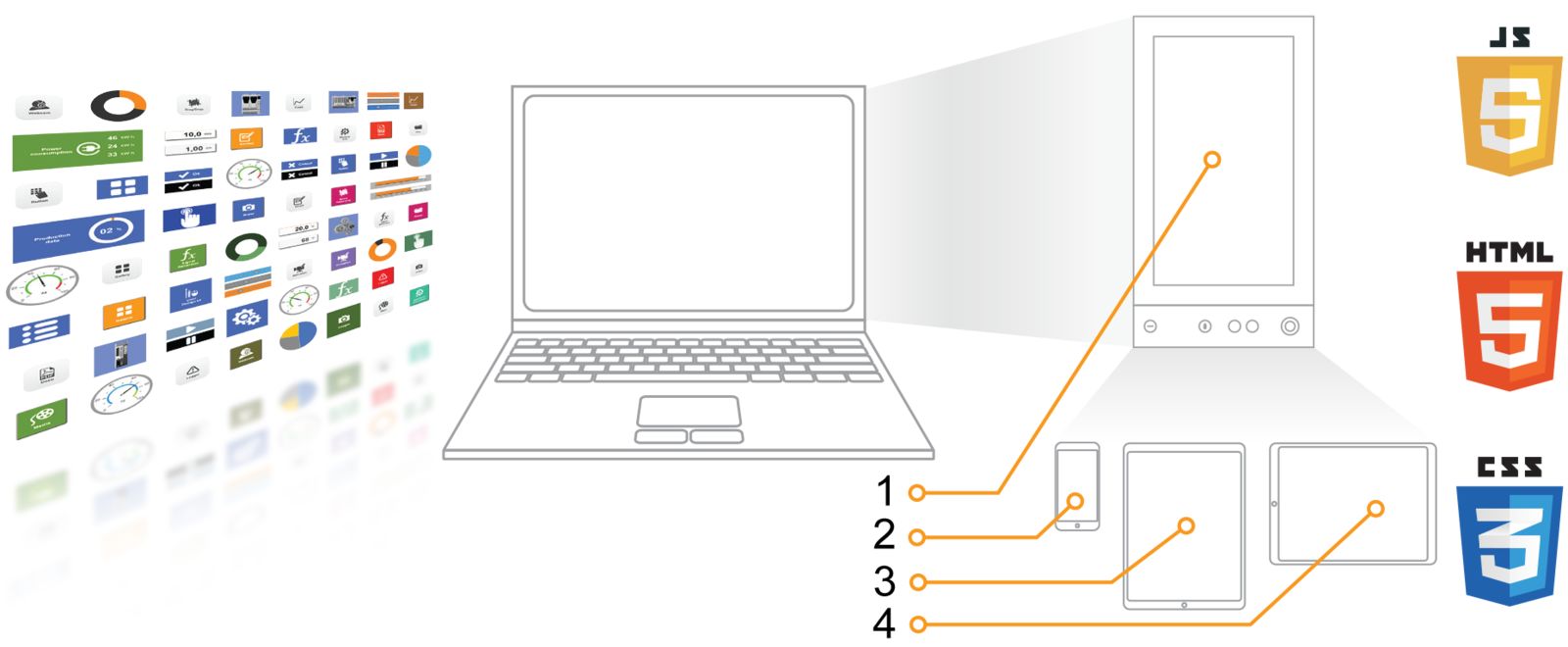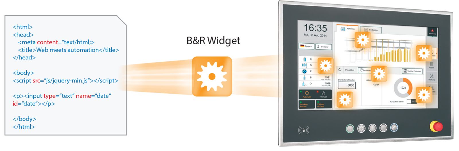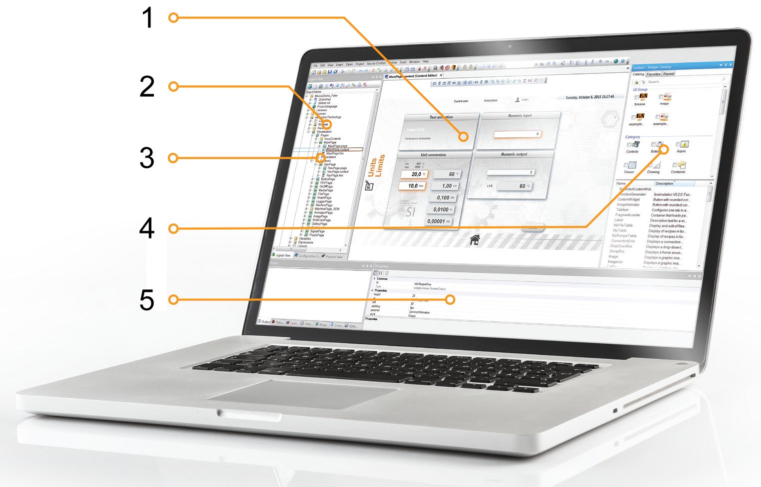 Con mapp View, los ingenieros de automatización disponen de todas las herramientas necesarias para crear pantallas de HMI habilitadas para la web, potentes e intuitivas. No es necesario utilizar la tecnología web subyacente. Esta tecnología está encapsulada en widgets, que simplemente se arrastran y sueltan para después configurarlos.