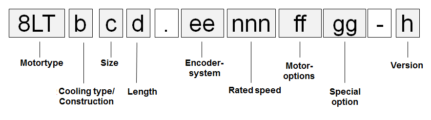 Los motores síncronos trifásicos 8LT están disponibles hasta en seis longitudes distintas. Disponen de diferentes potencias nominales con idénticas dimensiones de la brida. Las diferentes longitudes se diferencian por un número (d) en el número de modelo (3, 4, 5, 6, 7, 8).