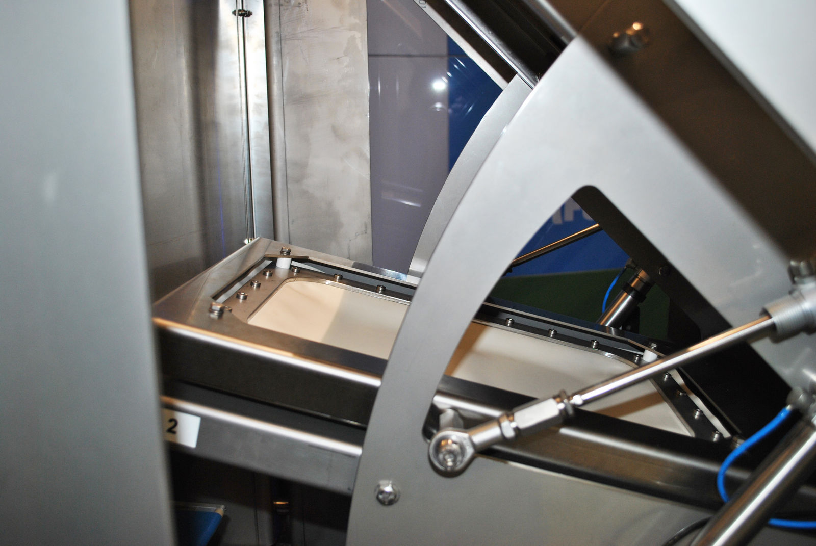 Oxipack tenía algunas ideas claras acerca de lo que esperaba obtener de los desarrolladores de Geurtsen. "Debido a algunas experiencias negativas anteriores, al principio me indicaron que no instalara una cinta transportadora", comenta Dietrich. De modo que ideó una serie de conceptos alternativos, como por ejemplo un sistema en el que las cámaras de vacío están dispuestas en una especie de estantería durante la medición. Al final, no obstante, casi todas las ideas resultaron ser demasiado costosas y solo quedó una opción factible. "Les gustara o no, la cinta transportadora era lo más adecuado", comenta Dietrich riendo. Pero, a diferencia de la cinta transportadora horizontal que Oxipack había utilizado anteriormente, Dietrich redujo enormemente la superficie útil necesaria poniéndola de costado, como una noria.