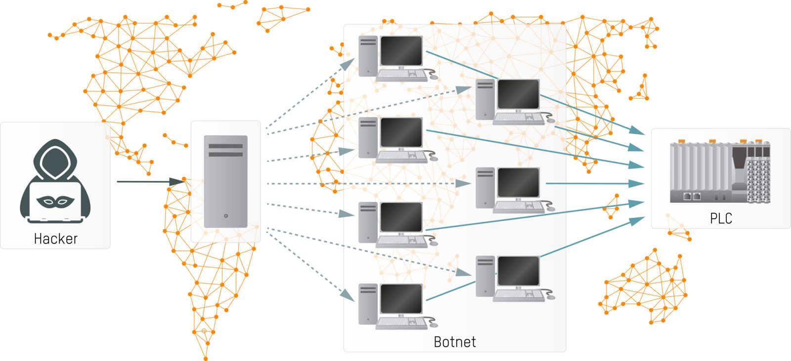 Los hackers pueden paralizar los controles y, por lo tanto, máquinas enteras, por ejemplo, al colapsarlos con tráfico. Esto se conoce como ataque DDoS (denegación de servicio distribuida, por sus siglas en inglés): Un hacker distribuye programas de ataque a través de la llamada botnet (red de bots) que comprende varios cientos de miles de ordenadores, smartphones y tabletas, convirtiéndolos en armas activas. A una orden, estos bots bombardean un control de máquina con tantas solicitudes simultáneas que provoca su fallo por carga excesiva y la máquina se detiene, como lo demostró recientemente un ataque de malware realizado contra un fabricante de microprocesadores.