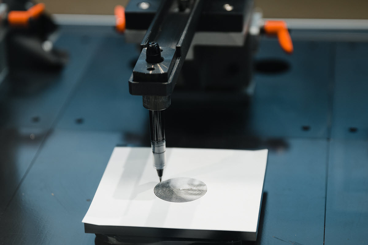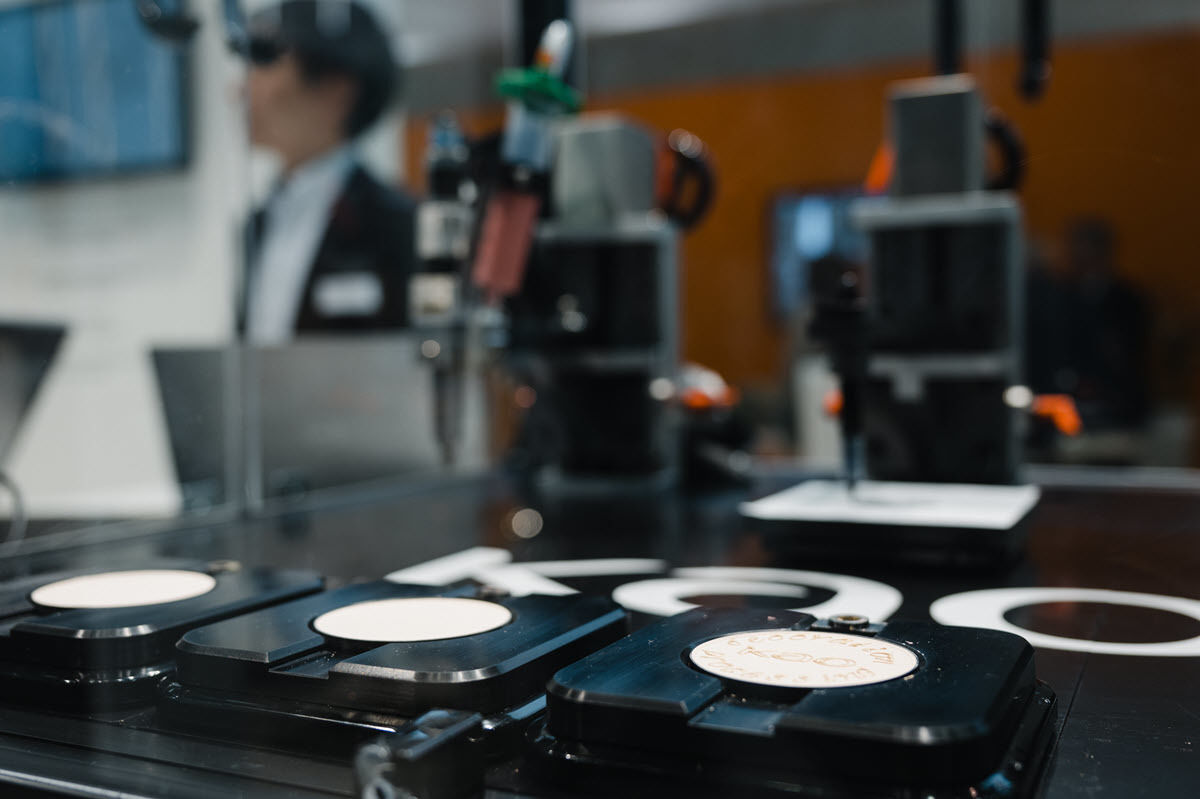 Cette nouvelle machine de KAO crée des images décoratives à partir de poudre de fond de teint. Chaque boîtier de poudre est porté par une navette effectuant des mouvements sous une buse fixe. La grande précision et la liberté de mouvement des navettes permet de transformer chaque boîtier en une oeuvre d'art unique.