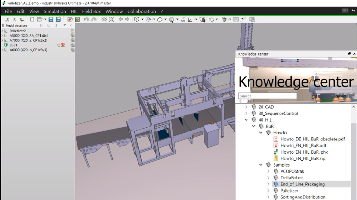 L'installation d"industrialPhysics - B&R Edition" donne également accès au "Knowledge Center". Ce système d'aide contient des modèles de simulation supplémentaires, documentation et projet Automation Studio inclus.