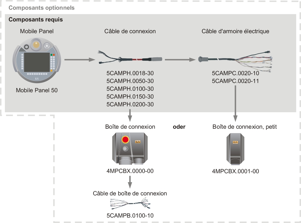 • La connexion à l'armoire électrique s'effectue soit directement avec un câble (5CAMPC.0020-10 ou 5CAMPC.0020-11) et, en option, avec une boîte de connexion de taille réduite (4MPCBX.0001-00),