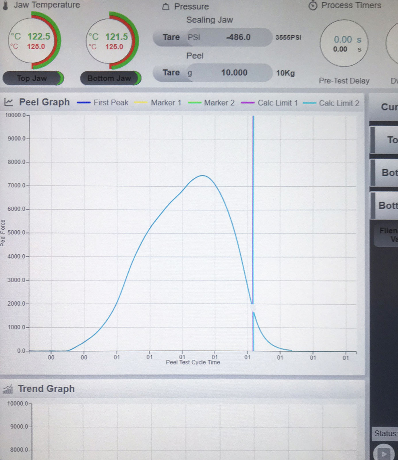 The software also introduces more efficient interaction capabilities with the test results. For instance, after multiple hot tack tests have been performed, the software provides a trend analysis graph. This gives the operator a detailed picture of the heat-sealing characteristics of the film between two temperature extremes. Having precise control of process variables such as temperature, pressure and duration enables an optimal balance between material specifications, packaging machine speed and seal integrity.