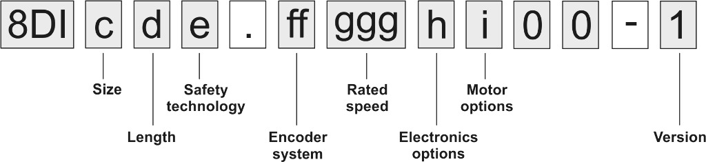 8DI ACOPOSmotor modules are available in three different sizes (3, 4 and 5). They have different dimensions (especially flange dimensions) and power ratings. These different sizes are indicated by a number represented by (c) in the model number. The larger the number, the larger the flange dimensions and power rating for the ACOPOSmotor module.