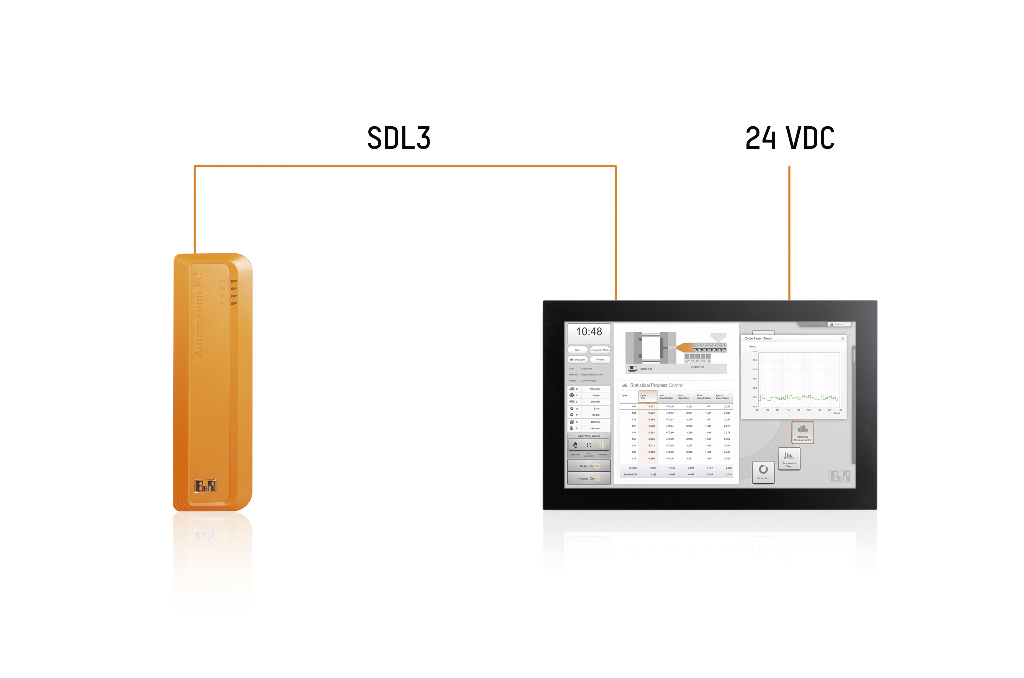SDL3 makes it possible to operate a panel up to 100 meters away from an industrial PC using a standard Ethernet cable. This allows HMI devices to be installed precisely where they are needed, even on large machines. This technology does not require the panel to be equipped with PC architecture. No CPU, memory or operating system is needed. SDL3 transfers image data uncompressed and in resolutions up to full HD. The image data is not converted or processed on the panel, so the display shows the content at the same speed and quality as it is generated by the PC industriali graphics unit.