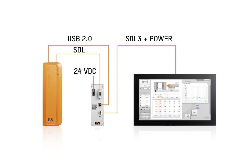Not only does SDL3 transfer all communication data between the industrial PC and the Automation Panel using a single cable; it can also handle the power supply for the panel. This is done using an SDL3 converter connected between the PC and the panel. This type of cabling is ideal when only supplying the panel and its membrane keys and LEDs. Particularly when installing panels on swing arm systems, cabling is considerably simplified by using a single cable without the additional 24 VDC connection. If additional mechanical switching elements such as hard-wired push buttons, key switches and E-stop buttons are also present and there is already a 24 VDC supply on the panel, an Automation PC 910 with integrated SDL3 transmitter may be a well-suited option.
