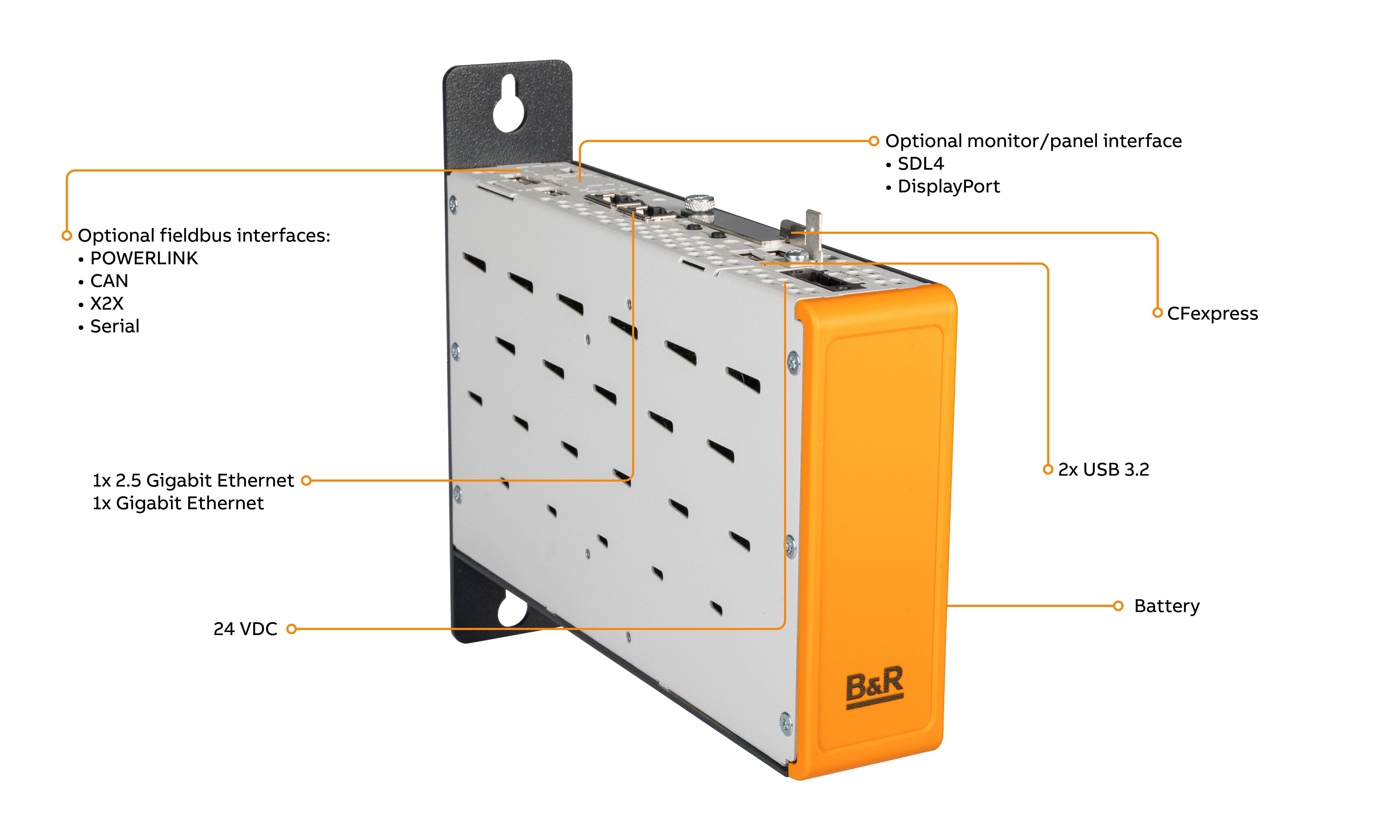 The Automation PC 2300 uses CFexpress as its mass storage format. CFexpress is an ultra-fast and cost-effective storage solution that combines top performance with a particularly robust design. This makes the PC ideal for industrial environments – even under demanding conditions. B&R is among the few manufacturers to adopt CFexpress, offering a highly durable and maintenance-friendly storage technology.