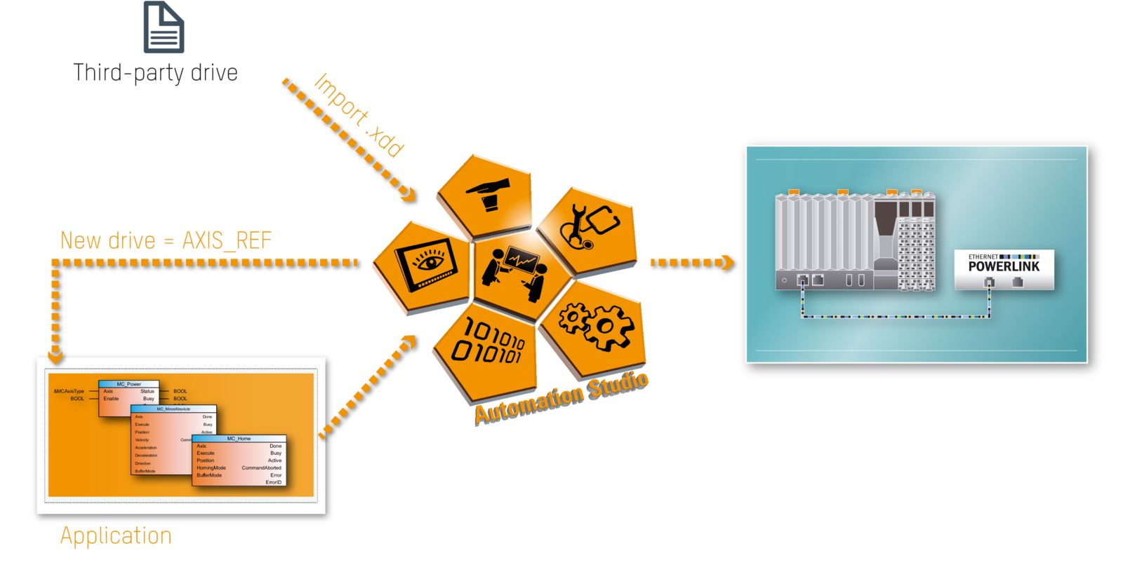 mapp Axis supports all B&R drives and DS402-compliant drives from third parties with a POWERLINK interface. Developers program DS402 drives in the same way as B&R drives: using mapp technology or PLCopen function blocks. The drives are also incorporated into the automation project in the same way as B&R drives. To make this possible DS402 drives must comply with the generally applicable "CAN in Automation" standard in accordance with IEC 61800-7-201.