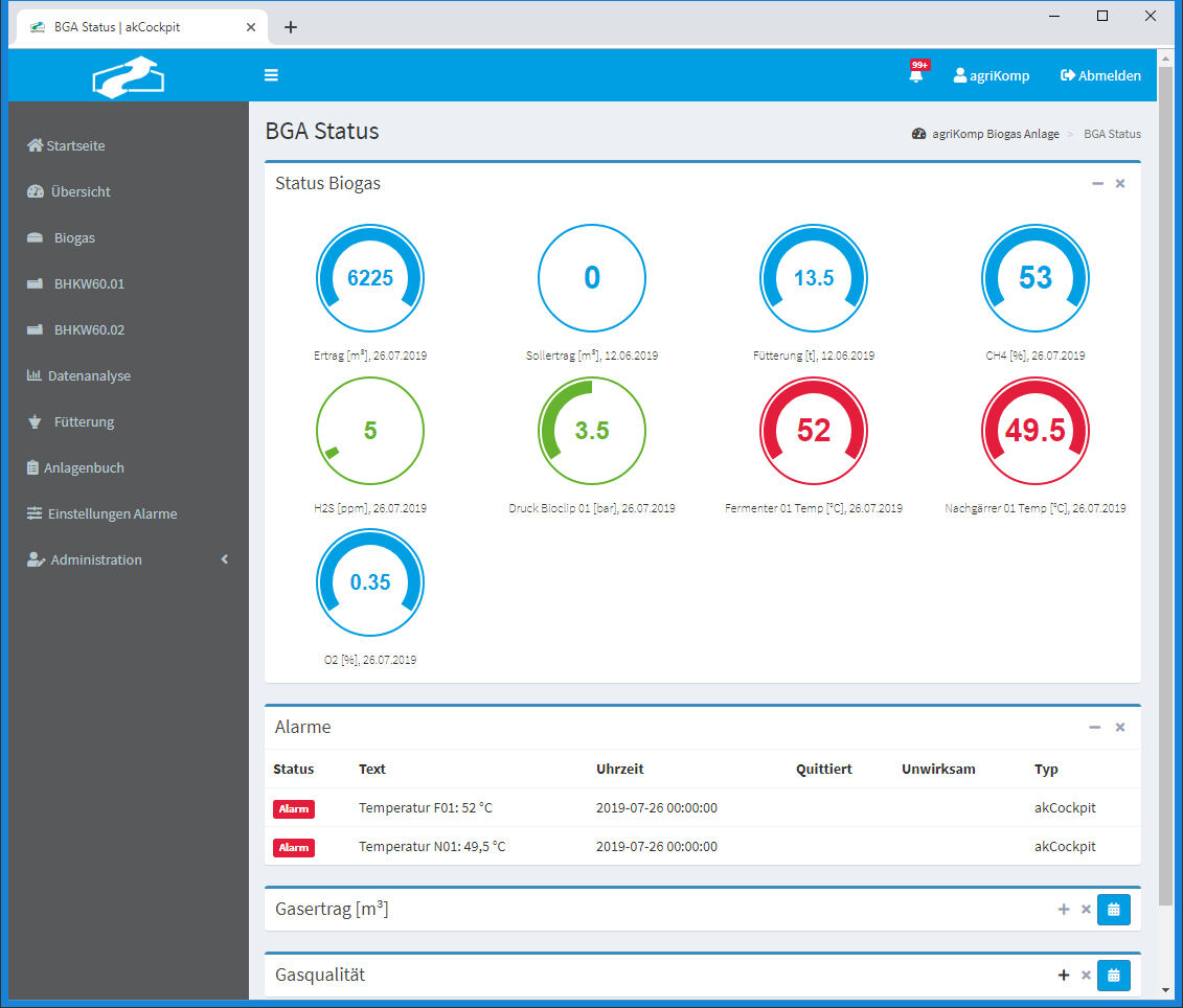 The cockpit programmed with APROL gives the operator a quick overview of the status and efficiency of the biogas plant.
