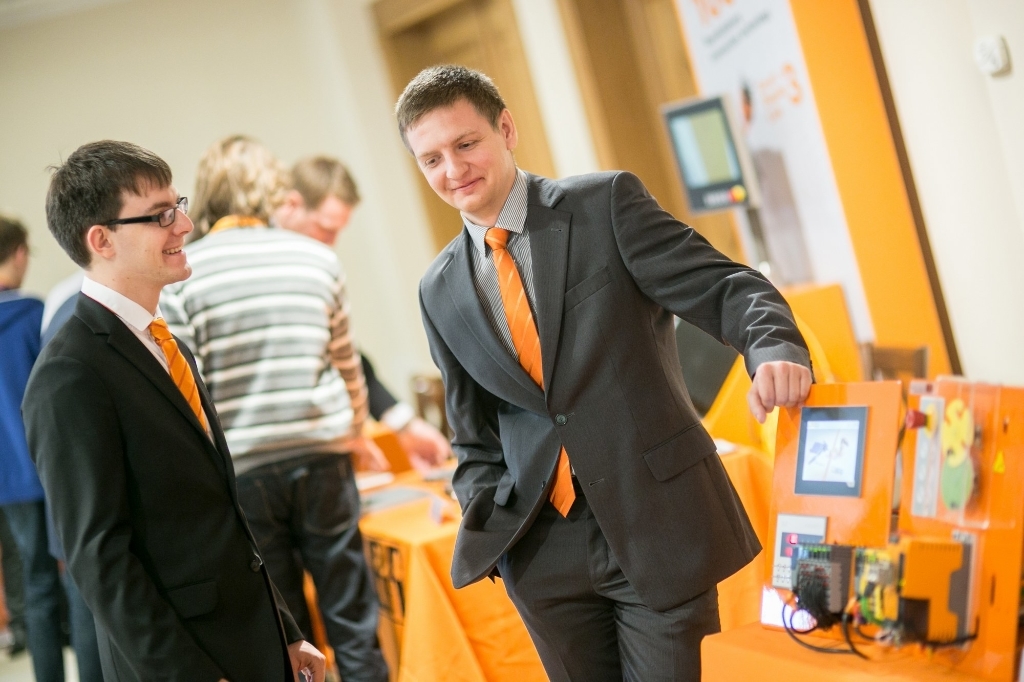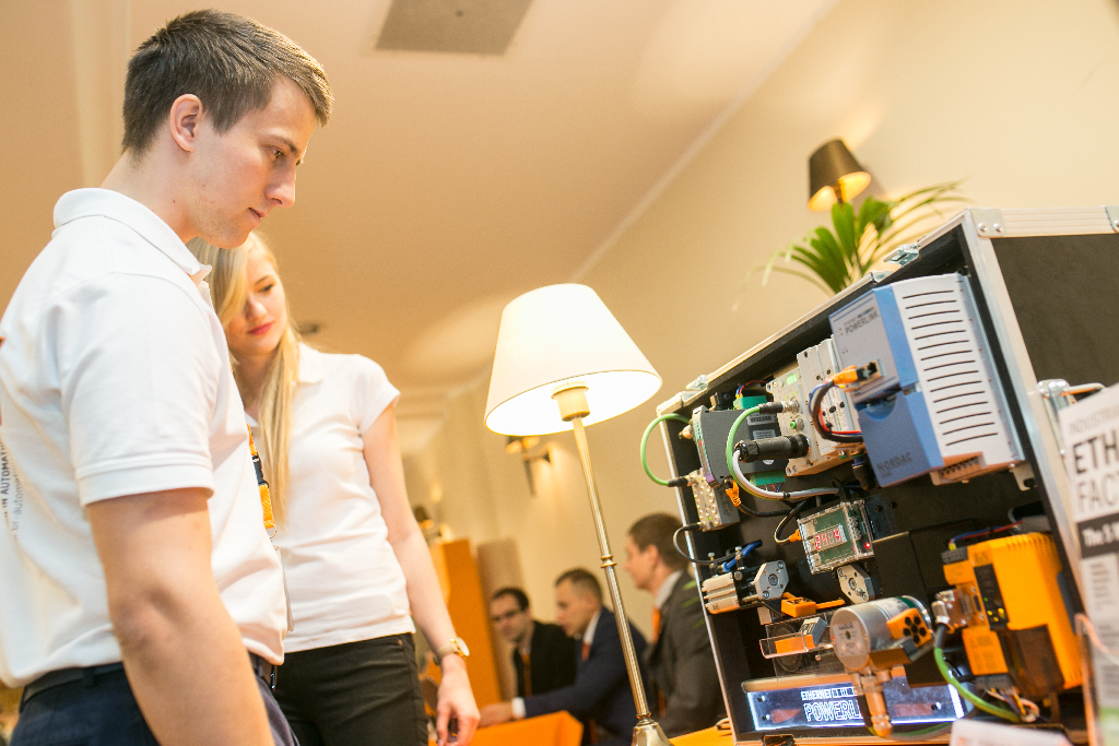 Były to dwa stanowiska. Stażyści z Poznania pokazywali linię do sortowania i kontroli jakości produktów i przedstawili w jaki sposób zaprogramowali system sterowania, który miał realizować zadania rozpoznawania obrazu, ważenia i sortowania. System ten jest obsługiwany przy pomocy urządzeń mobilnych takich jak smartfon czy tablet. Dodatkowo każdy z elementów sterowania połączony jest poprzez sieć POWERLINK. Ciekawą częścią systemu jest też wyświetlacz, który został zbudowany i zaprogramowany przez zespół praktykantów i stażystów.