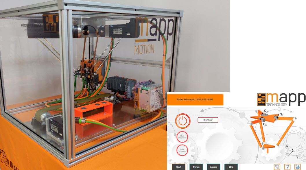 Opis: Do realizacji aplikacji student zastosował komponenty mapp Technology zarówno do sterowania robotem, obsługi alarmów, jak i wizualizacji. Zadanie wymagało sterowania robotem synchronicznie do taśmociągu oraz programowego zabezpieczenia obszaru pracy robota. Aplikacja umożliwia sterowanie ręczne oraz diagnostykę całego stanowiska z poziomu wizualizacji webowej. Ponadto samo stanowisko zostało zmodernizowane z użyciem elementów wykonanych w technologii druku 3D. Zrealizowane zadanie odpowiada typowemu dla robotów Delta pozycjonowaniu elementów znajdujących się w ruchu, co jest często używane w zakładach przemysłowych.