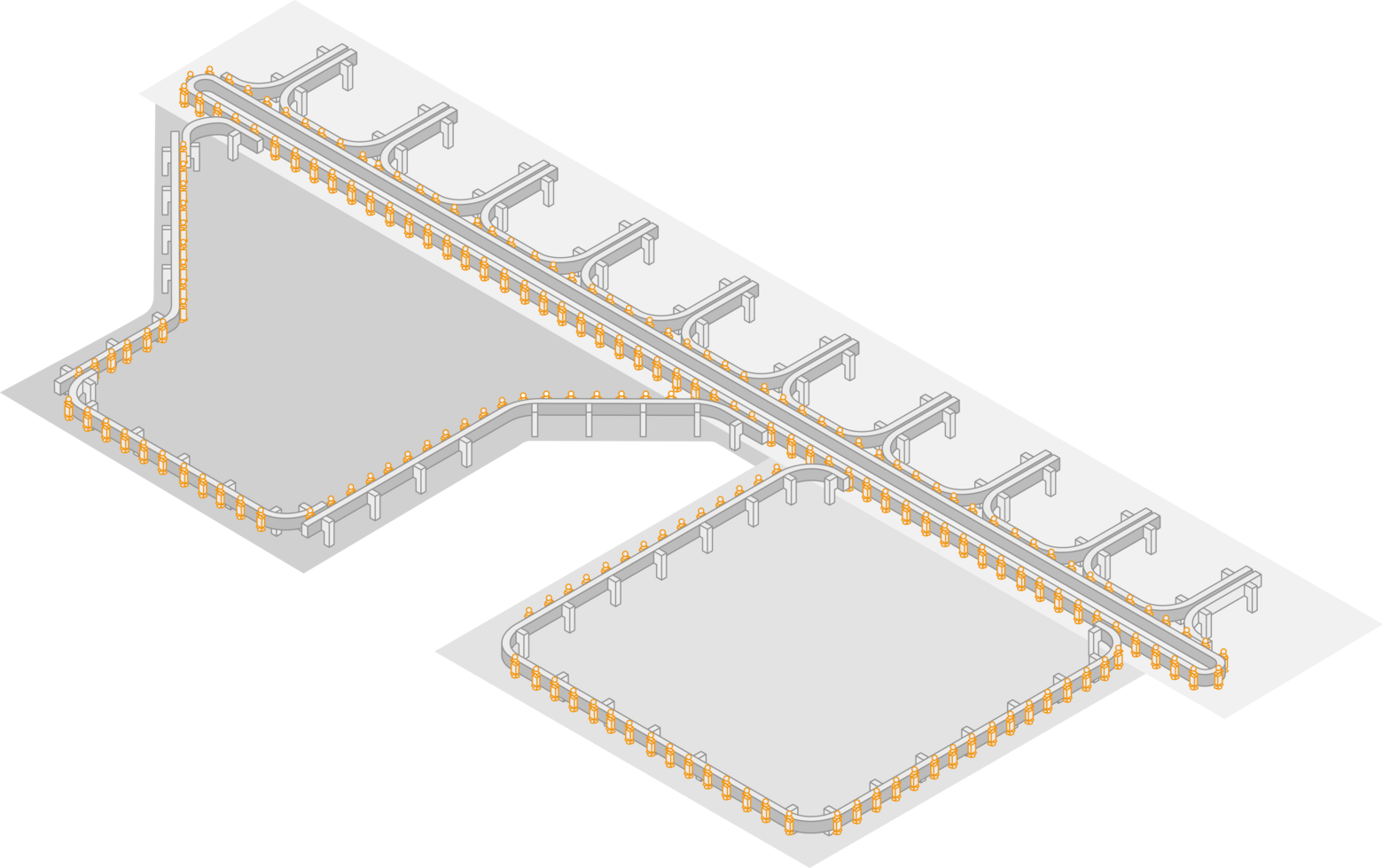 With highly dynamic control over the speed, spacing, and routing of each individual shuttle, it becomes possible to perform processing steps all along the track, even while in motion. Square meters otherwise consumed by buffer zones and empty stretches of conveyor instead host high-value processing.
