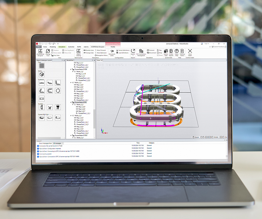 The ACOPOStrak Designer tool allows process lines to be designed and simulated virtually on a PC in 2D and 3D using a drag-and-drop interface.