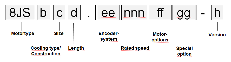 Motores síncronos trifásicos 8JS estão disponíveis em até cinco comprimentos diferentes. Eles têm potências diferentes, com idênticas dimensões de flange. Os comprimentos diferentes podem ser diferenciados por um número (d) no número do modelo.