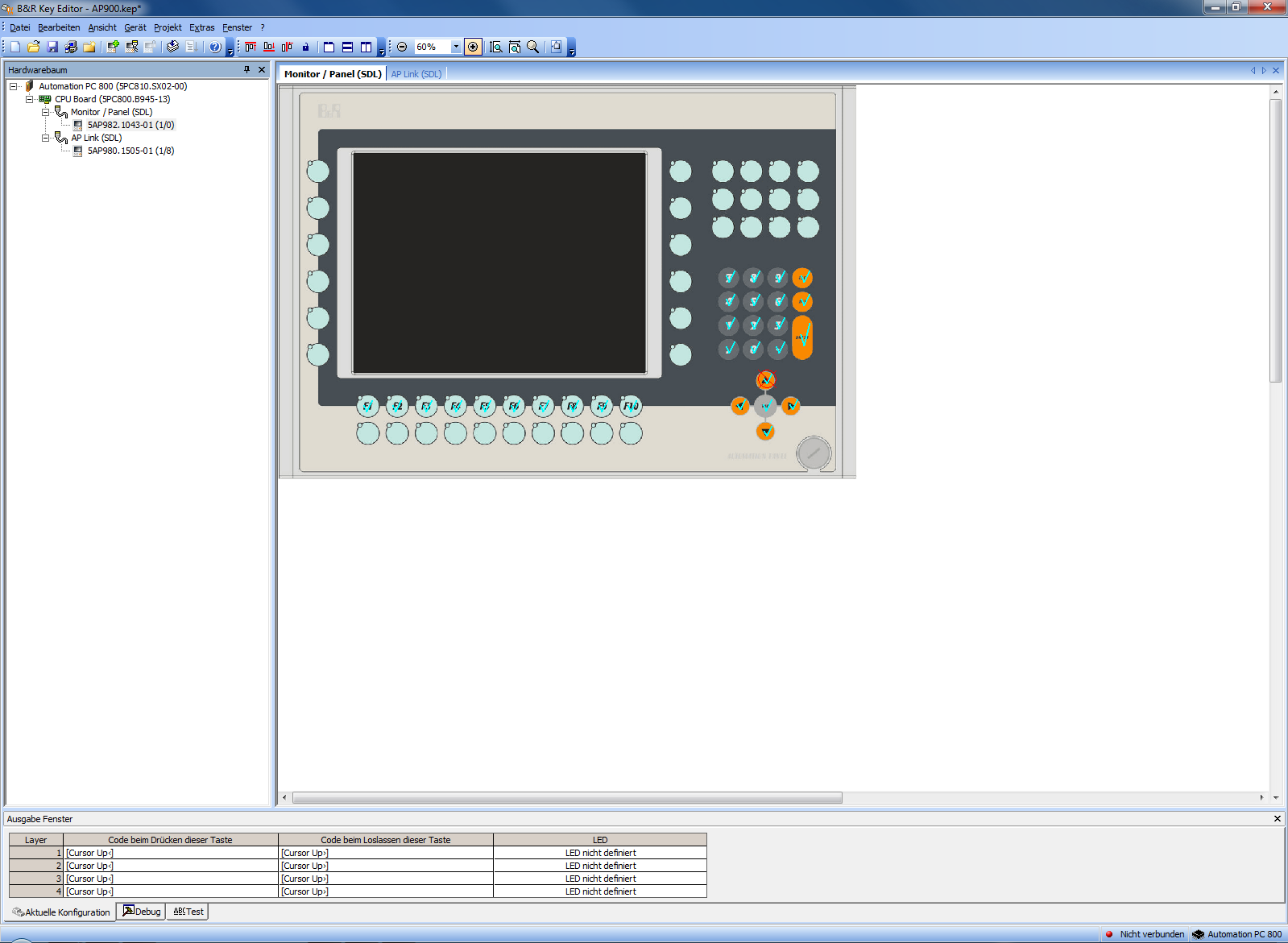 Em unidades de visualização, muitas vezes é necessário ajustar as teclas de função para o respectivo aplicativo. Nos sistemas baseado em Windows®, ao pressionar a tecla F1, a página de ajuda abrirá,o que muitas vezes não é o que é desejado para sistemas de visualização em modo de tempo de execução. Dispositivos B&R Automation Panel têm um programa com fácil edição de teclas. A funcionalidade de cada tecla pode ser configurada separadamente. Cada tecla pode ter até quatro funções. Vários caracteres podem ser enviados com uma único pressionamento de tecla.