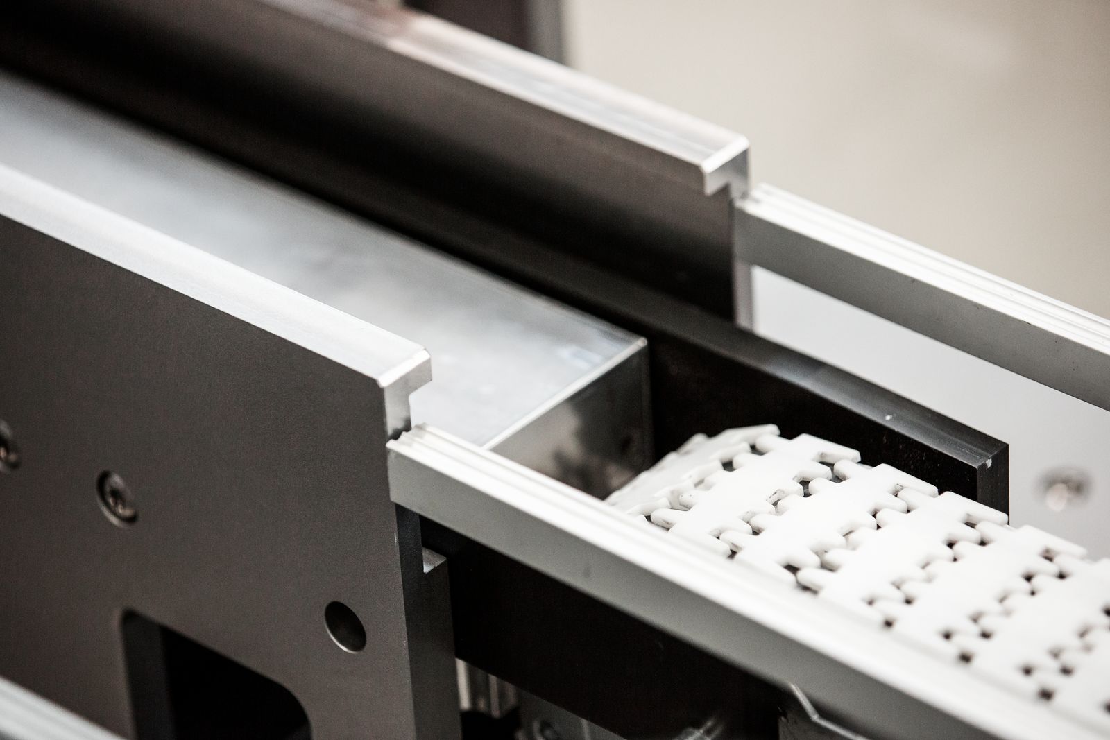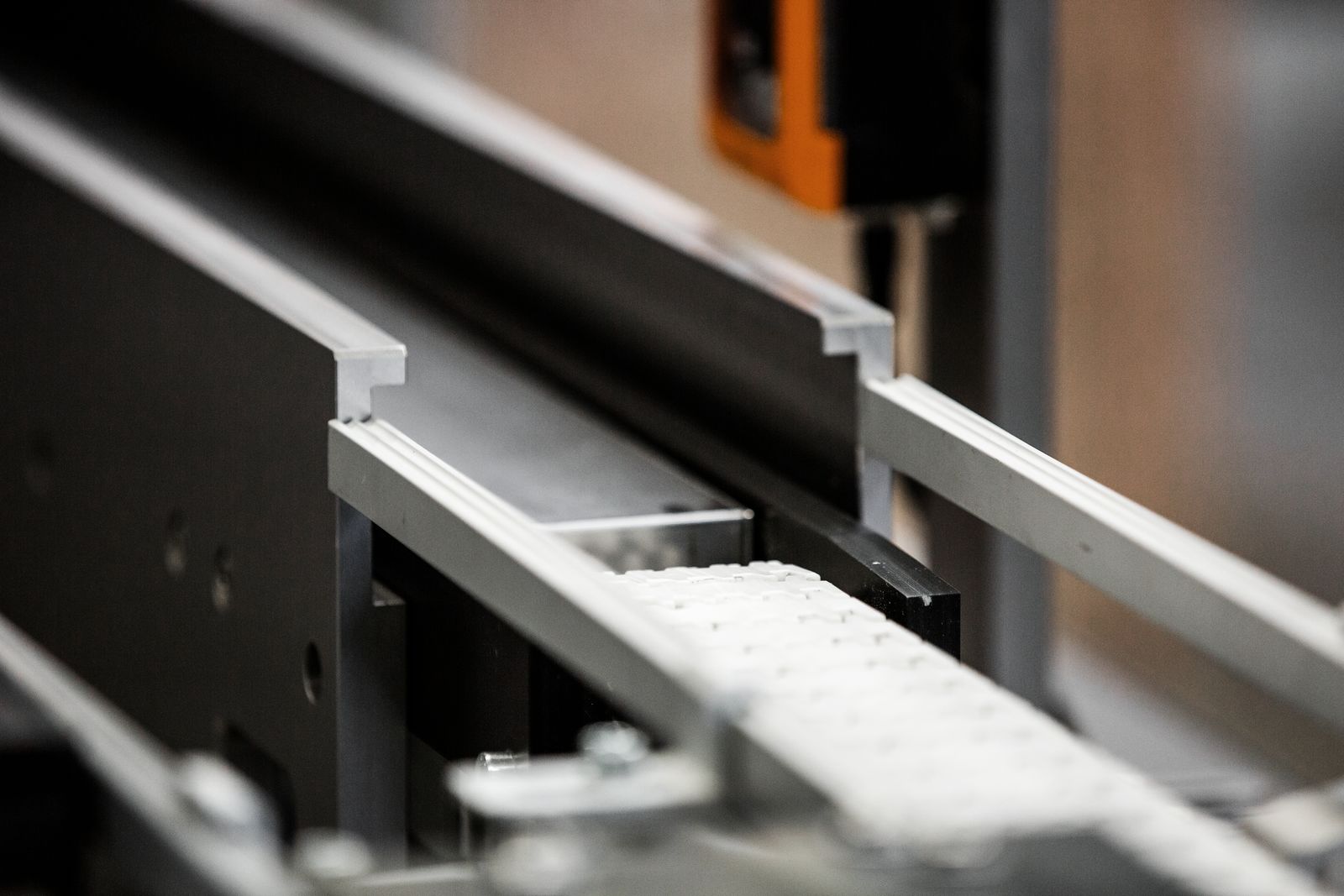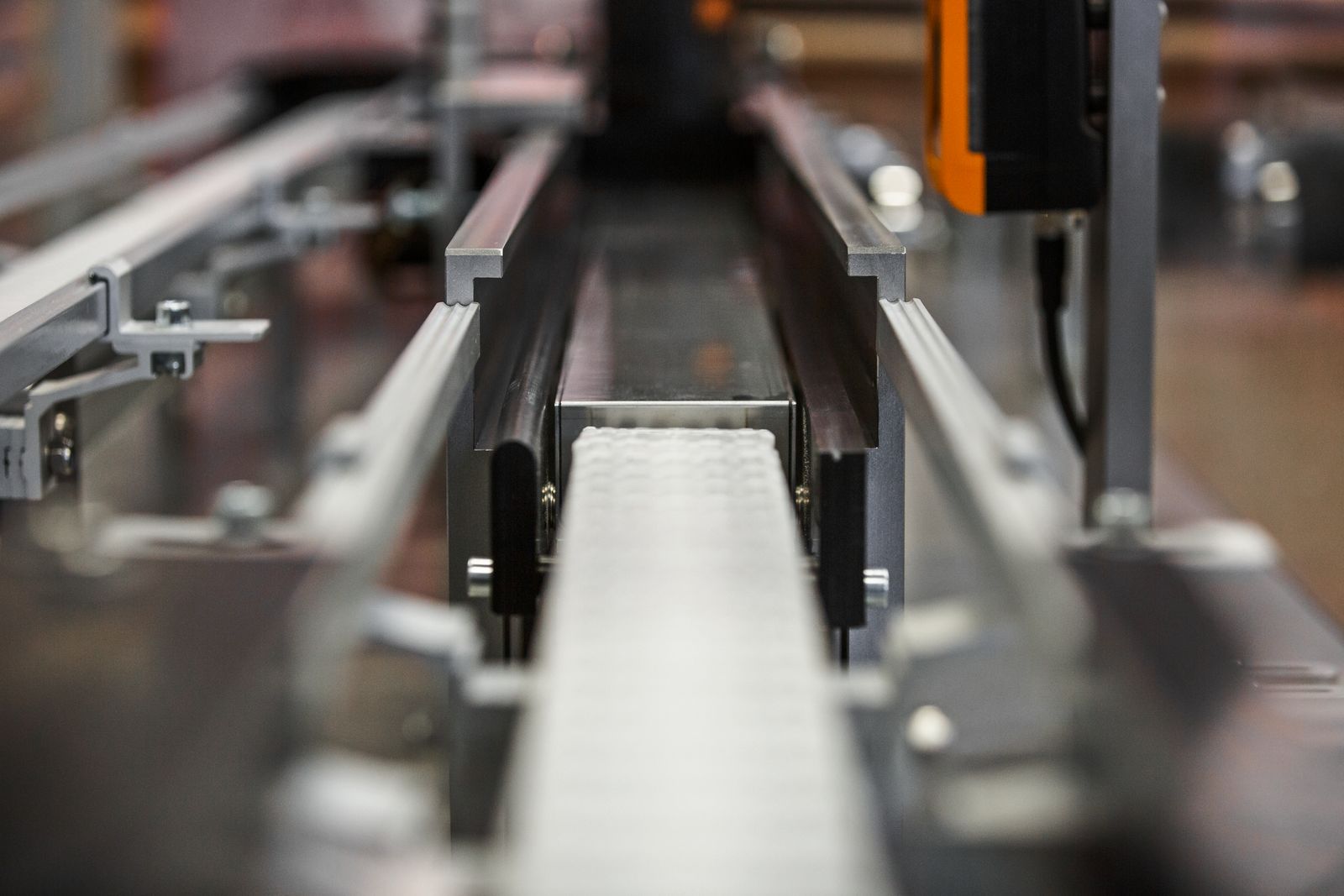 Guide rails ensure seamless transitions between the conventional conveyor belt and the intelligent ACOPOStrak.
