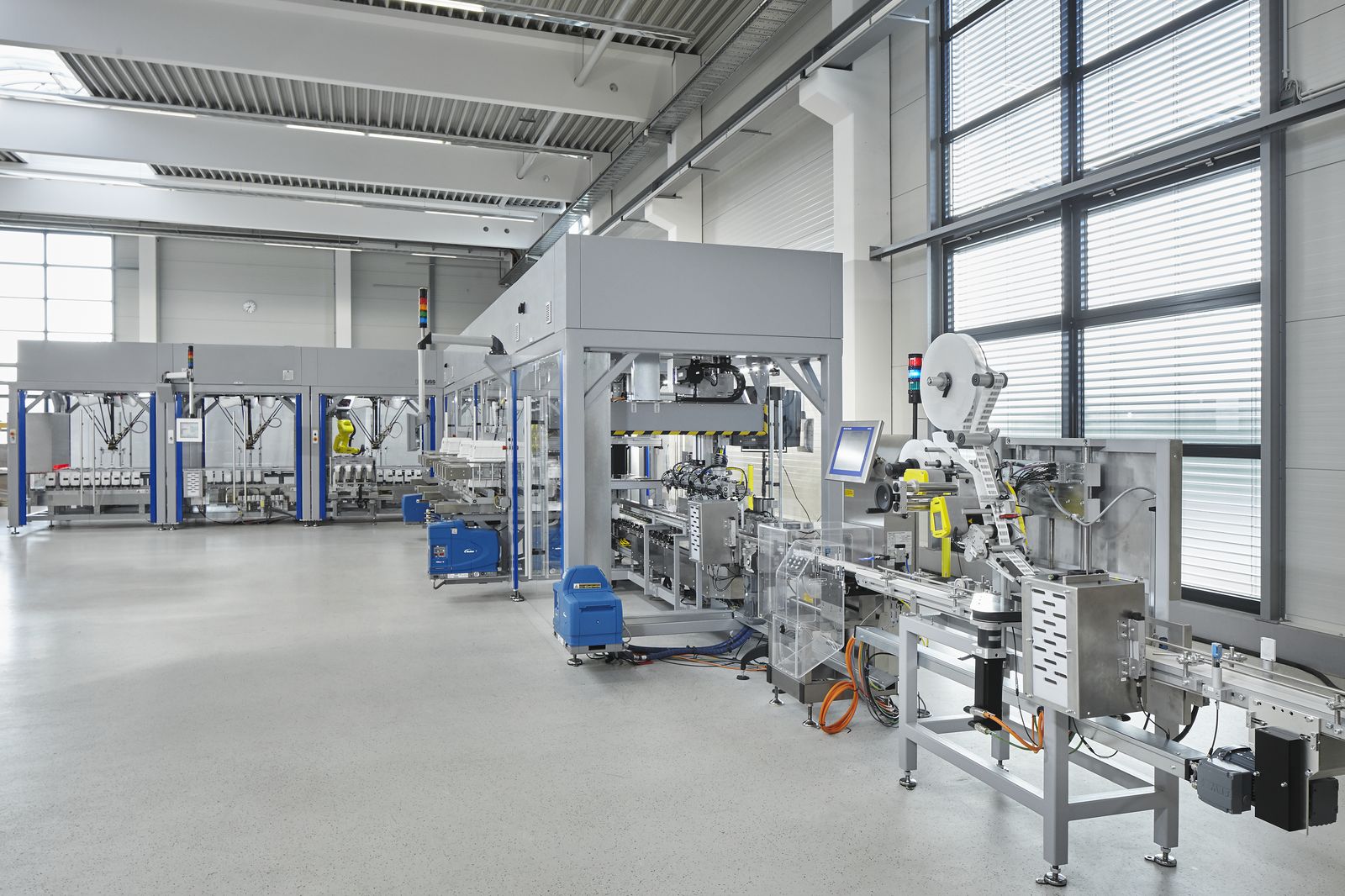 Cada um dos módulos usa o mesmo gabinete da máquina. As grandes portas de proteção transparentes oferecem uma visão desobstruída e um fácil acesso ao processo de embalagem. As unidades de suprimento e o hardware de controle estão escondidos no telhado da carcaça. Cada módulo pode ser operado como uma máquina autônoma - ainda assim, os enormes benefícios do projeto modular realmente entraram em jogo quando eles foram configurados e montados em uma linha de embalagem completa.