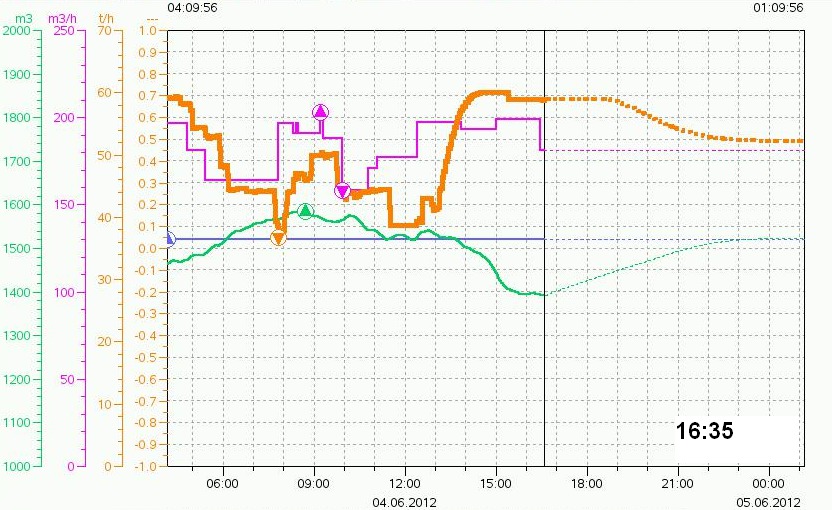 Стандартизированное приложение HMI, поставляемое с APROL MPC, регистрирует изменения расхода потока и уровня заполнения с течением времени. В отличие от полоски бумаги, выдаваемой старым самописцем, прогноз тенденций отображается непрерывно. Это помогает на основе плана потребления визуализировать будущие изменения уровня заполнения, а также выбор сроков и тенденцию изменений расхода на входе.