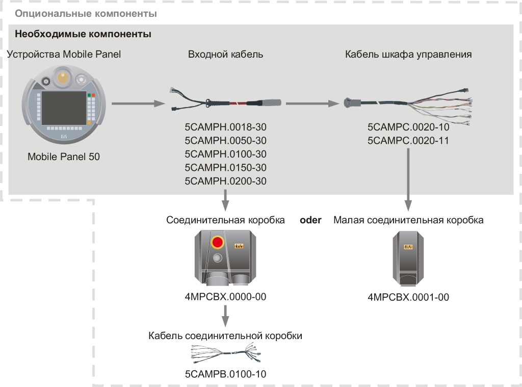 The attachment cables for Mobile Panel 50 devices are available in various lengths (5CAMPH.xxxx-30). Once the desired length has been selected, there are two variants to choose from: